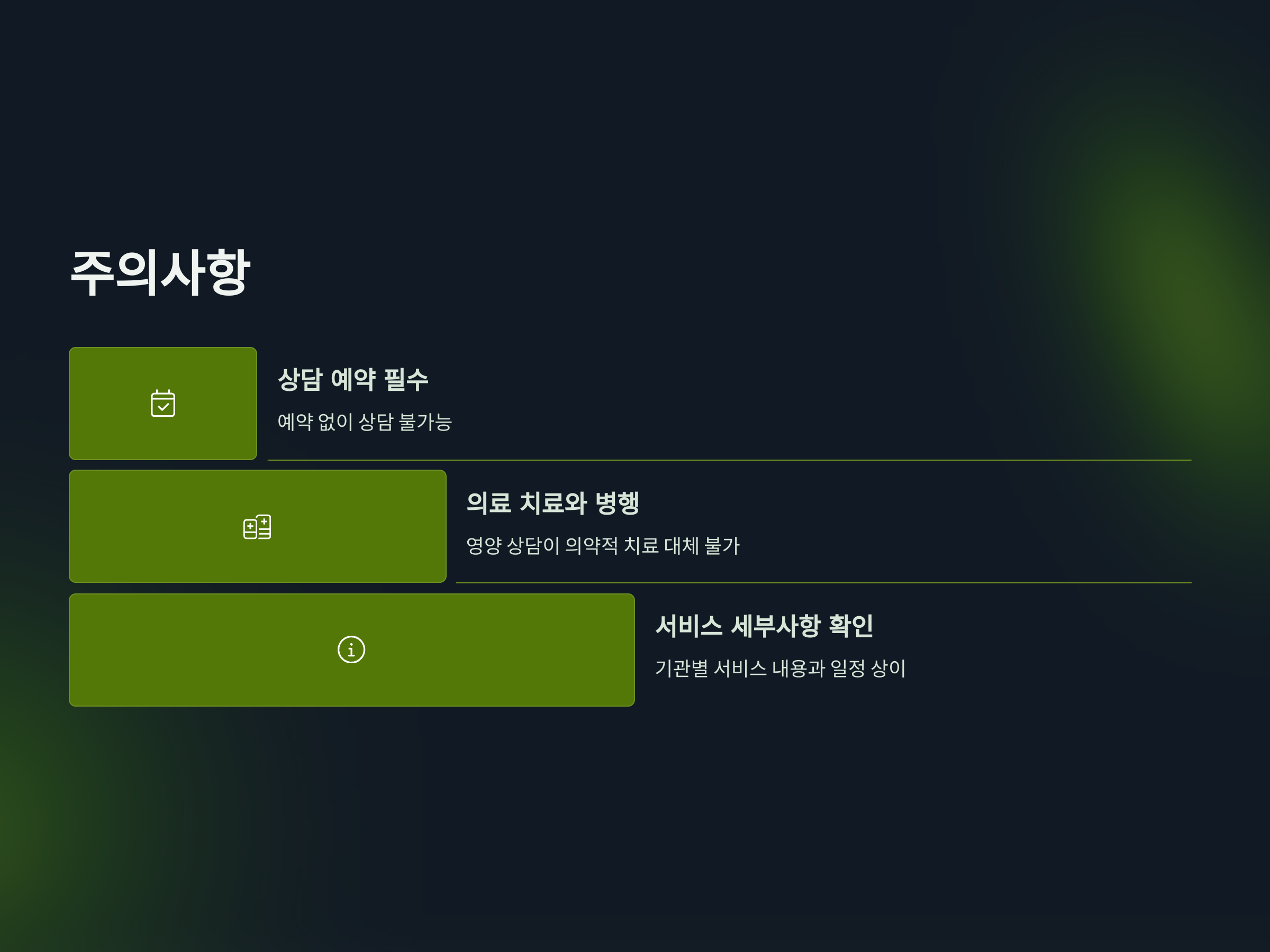 무료 영양 상담 서비스를 이용할 때는 몇 가지 주의사항을 염두에 두어야 합니다. 우선, 각 공공기관에서 제공하는 서비스의 세부 사항과 일정이 다를 수 있으므로, 신청 전 확인하는 것이 중요합니다. 또한, 상담이 끝난 후에도 지속적으로 건강 상태를 모니터링하고, 필요한 경우 후속 상담을 받는 것이 좋습니다.