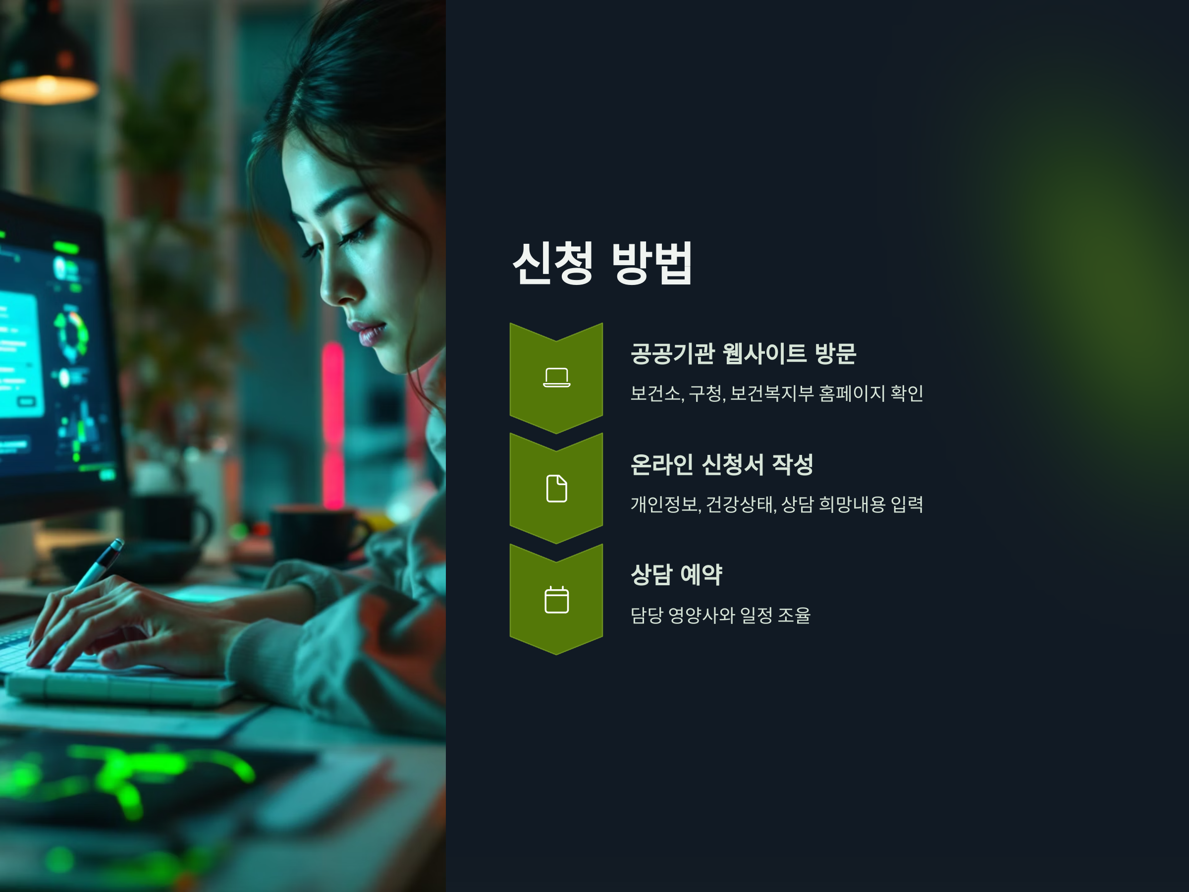 - 온라인 신청서 작성: 공공기관의 웹사이트에서 온라인 신청서를 작성합니다. 개인 정보와 건강 상태, 상담을 원하는 내용 등을 입력해야 합니다.