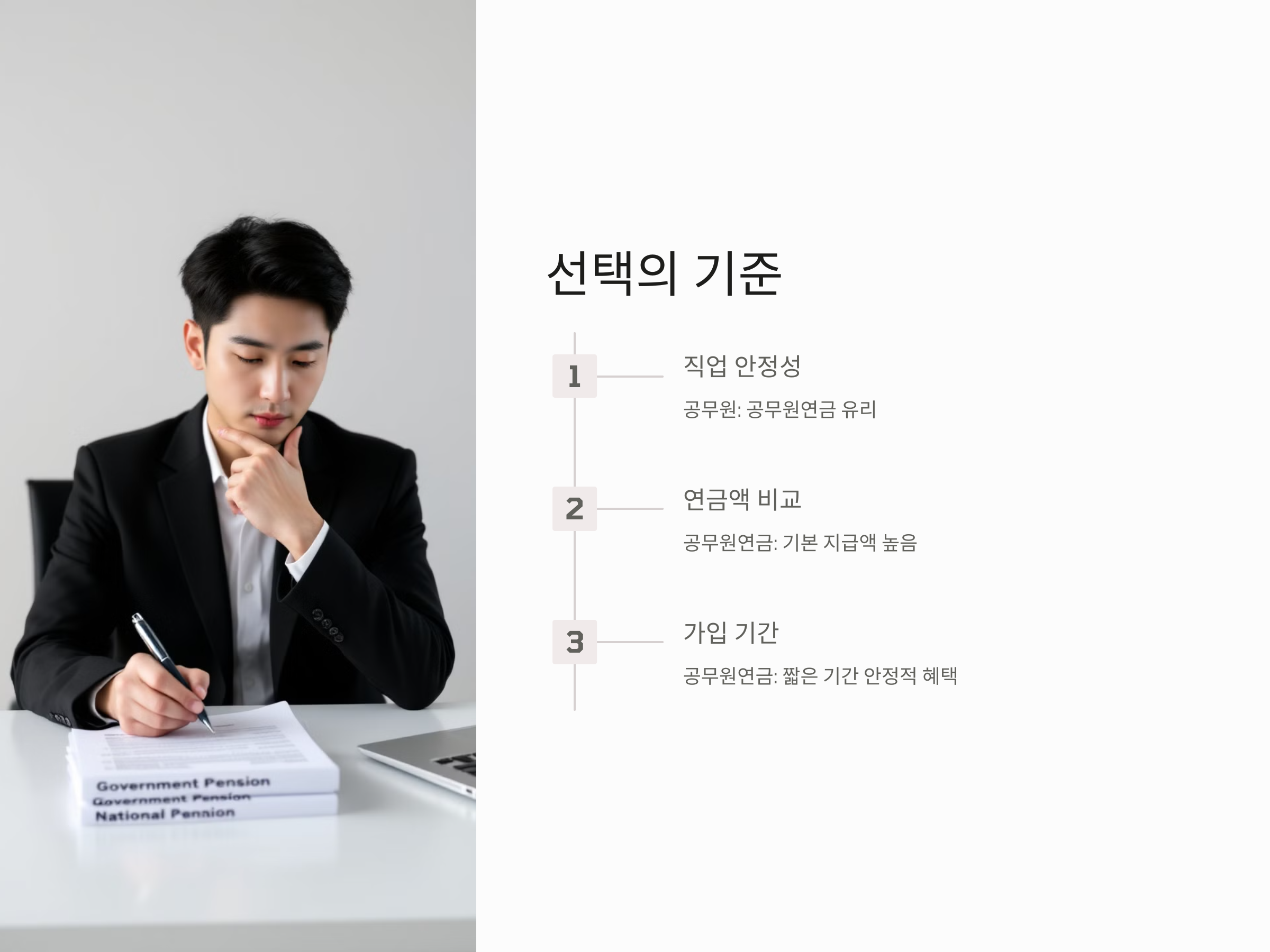 만약 공무원으로 재직 중이라면, 공무원연금이 훨씬 유리할 수 있습니다. 안정적인 직업을 바탕으로 더 높은 연금을 받을 수 있기 때문입니다. 그러나 일반적인 직장인이라면 국민연금이 적합할 것입니다. 국민연금은 직업에 관계없이 모두가 가입할 수 있기 때문에, 고용 불안정이 문제인 경우라도 대비할 수 있습니다.
