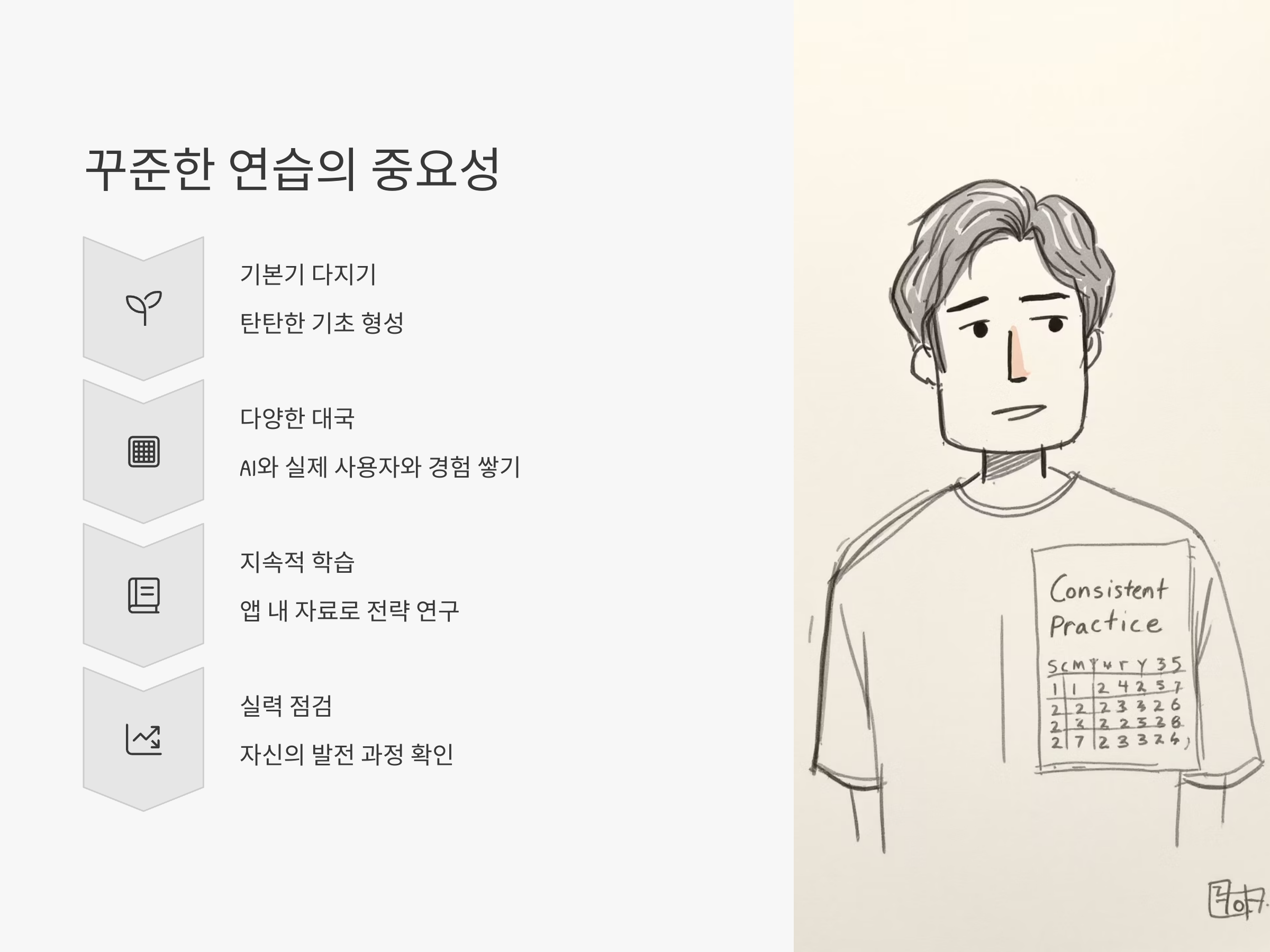 공식 바둑 앱을 통해 바둑 실력을 향상시키는 과정은 점진적이고 꾸준한 연습이 중요합니다. 처음에는 어려울 수 있지만, 기본기를 탄탄히 다지고 AI와의 대국, 그리고 다양한 사람들과의 대국을 통해 실력을 한 단계씩 높일 수 있습니다.