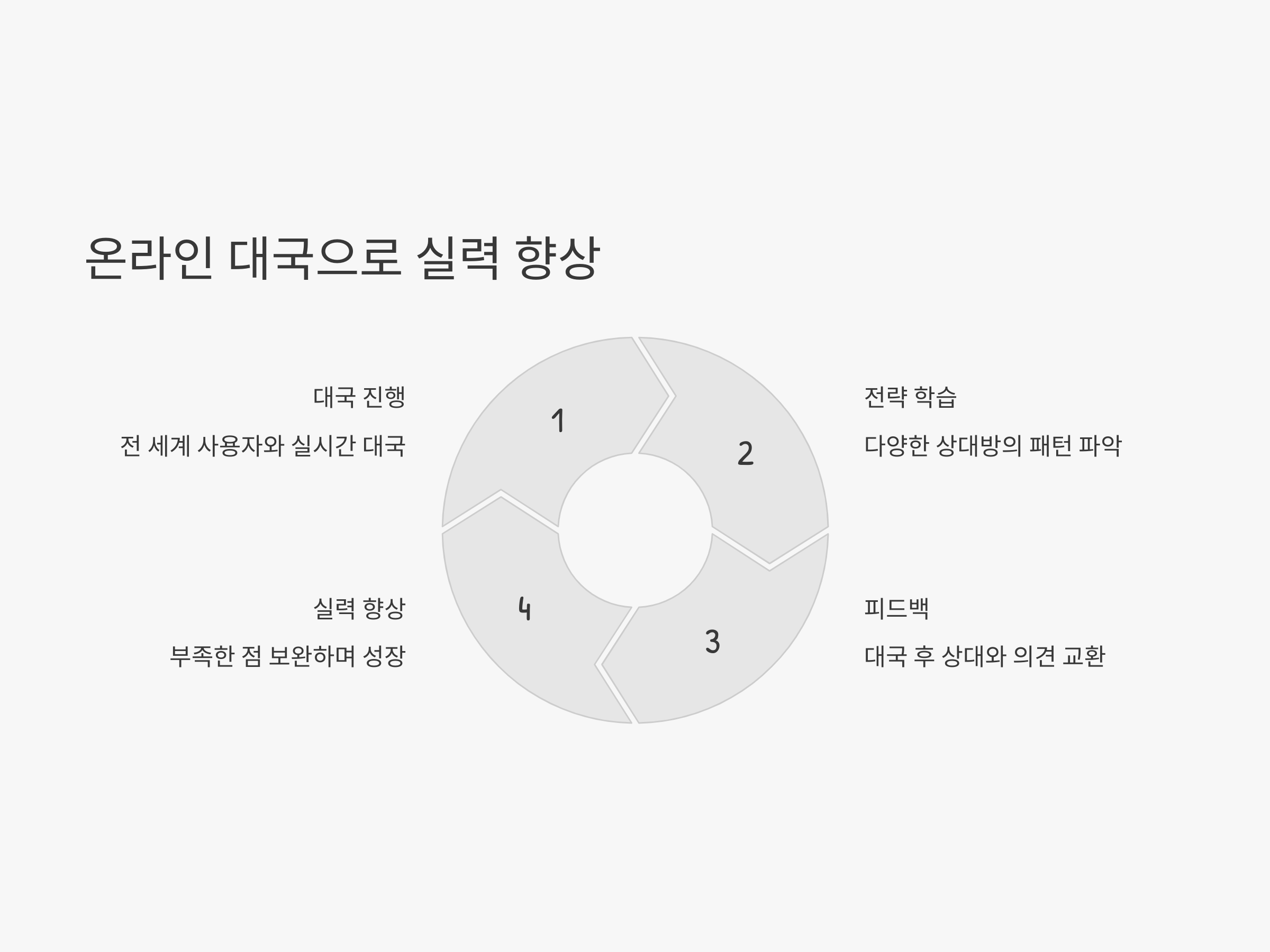 다른 사용자와 대국을 진행하면 상대방의 다양한 전략과 패턴을 학습할 수 있습니다. 또한, 대국을 마친 후에는 상대방과의 피드백을 주고받을 수 있는 시스템이 마련되어 있어, 자신의 부족한 점을 바로잡을 수 있는 기회를 제공합니다. 이처럼 다양한 사람들과의 대국은 실력을 더욱 다듬는 데 매우 효과적입니다.
