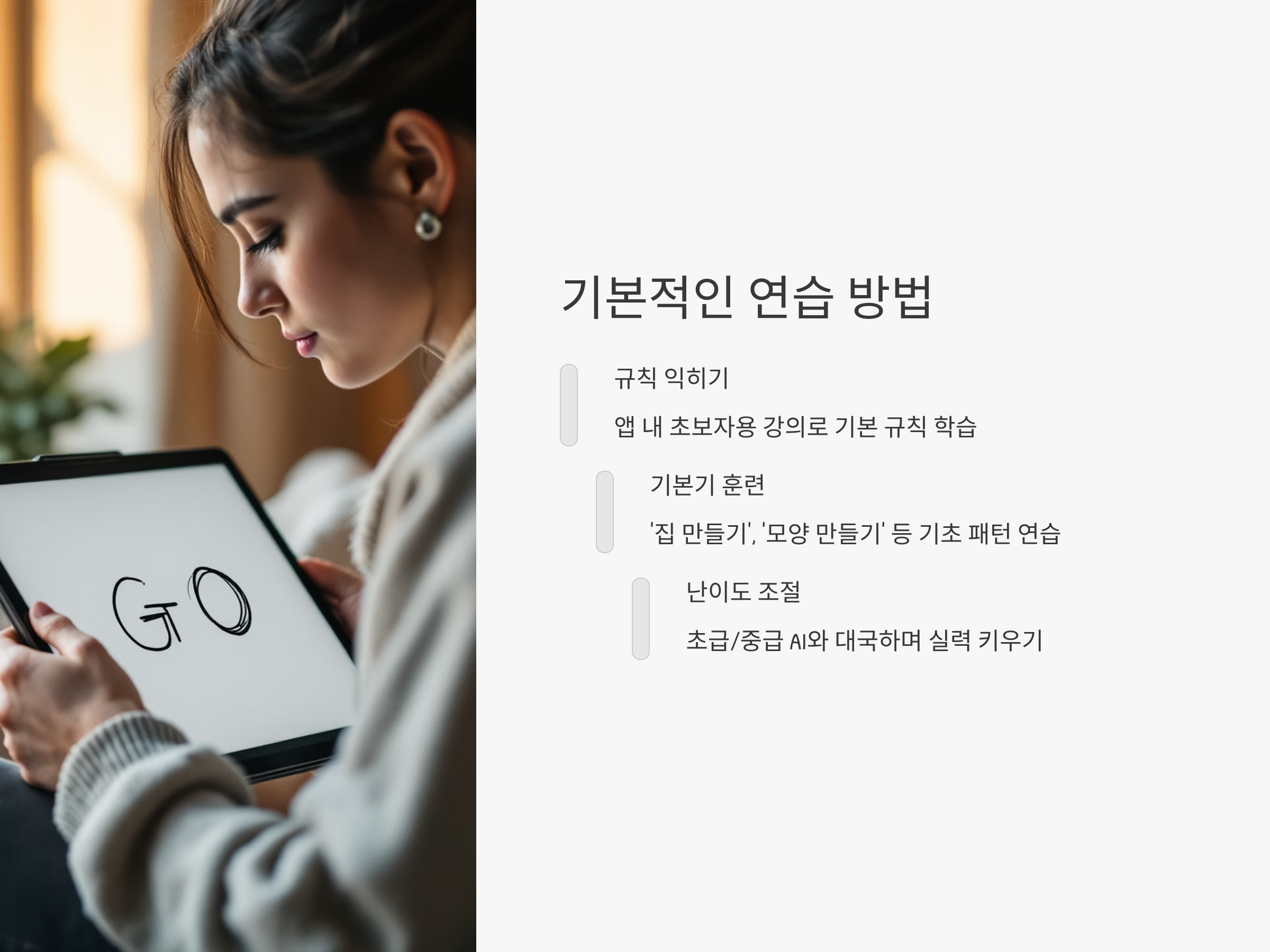 바둑 앱에서는 다양한 연습 모드를 제공하여, 사용자가 단계별로 실력을 향상시킬 수 있습니다. '기본기 훈련' 모드는 바둑에서 중요한 기법인 '집 만들기', '모양 만들기' 등을 학습할 수 있도록 도와줍니다. 이 모드를 통해 바둑의 기본적인 패턴과 전략을 몸에 익힐 수 있습니다.