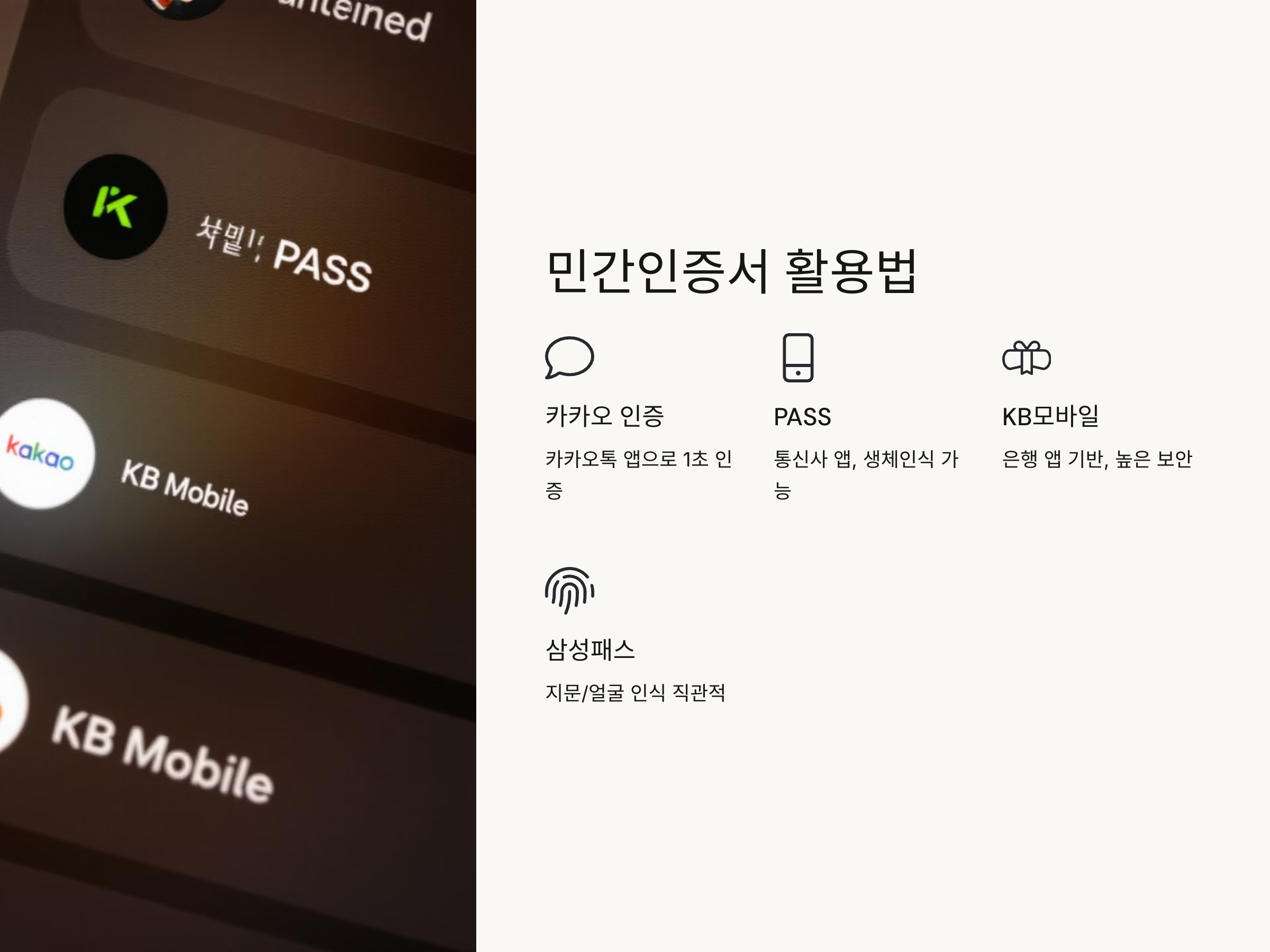 민간인증서는 이제 공공서비스 로그인에 있어 필수 도구로 자리 잡았습니다. 카카오 인증서는 카카오톡 앱을 통해 1초 만에 인증 요청을 받아 승인할 수 있고, PASS는 각 통신사(SKT, KT, LG U+)의 앱으로 생체인식 또는 비밀번호 인증이 가능합니다. 또한 KB모바일 인증서는 은행 앱 기반으로 보안 수준이 높고, 삼성패스는 지문 및 얼굴 인식을 통해 더욱 직관적인 로그인 경험을 제공합니다.