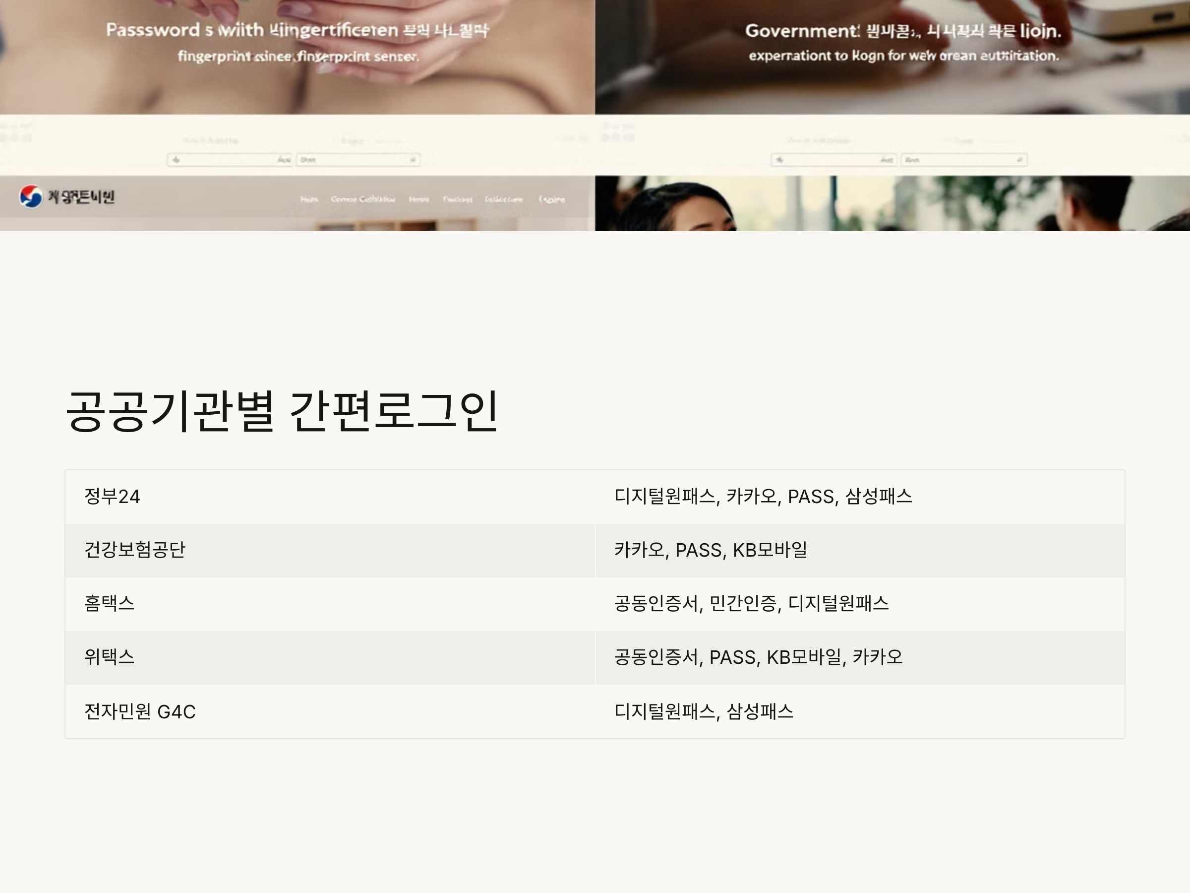 아래는 주요 공공기관 홈페이지에서 사용할 수 있는 인증 수단을 정리한 표입니다.