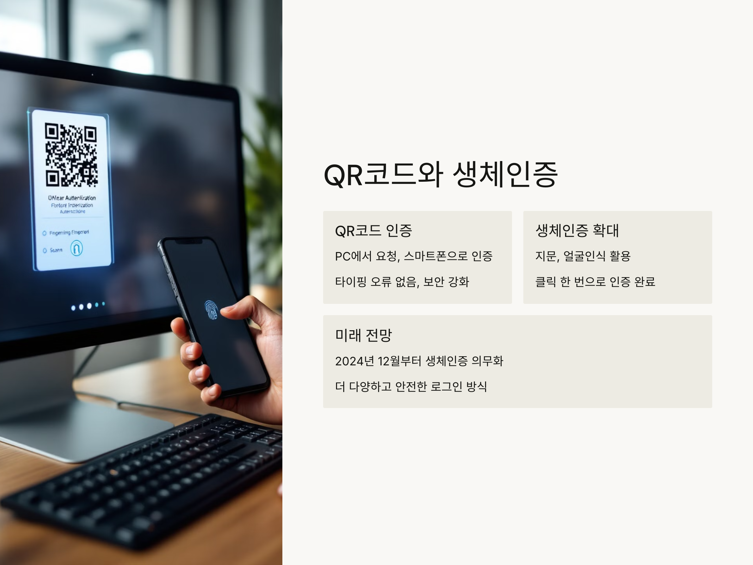 최근에는 PC에서는 QR코드로 인증을 요청하고, 스마트폰으로 간편하게 인증하는 방식이 널리 보급되고 있습니다. QR코드 인증은 타이핑 오류가 없고, 악성코드로부터의 위협도 줄일 수 있어 보안적으로도 안전합니다. 이와 함께 생체인증 기술도 확대되고 있습니다. 스마트폰에 내장된 지문인식, 얼굴인식 등을 활용하여 클릭 한 번으로 인증을 완료할 수 있는 시대입니다.