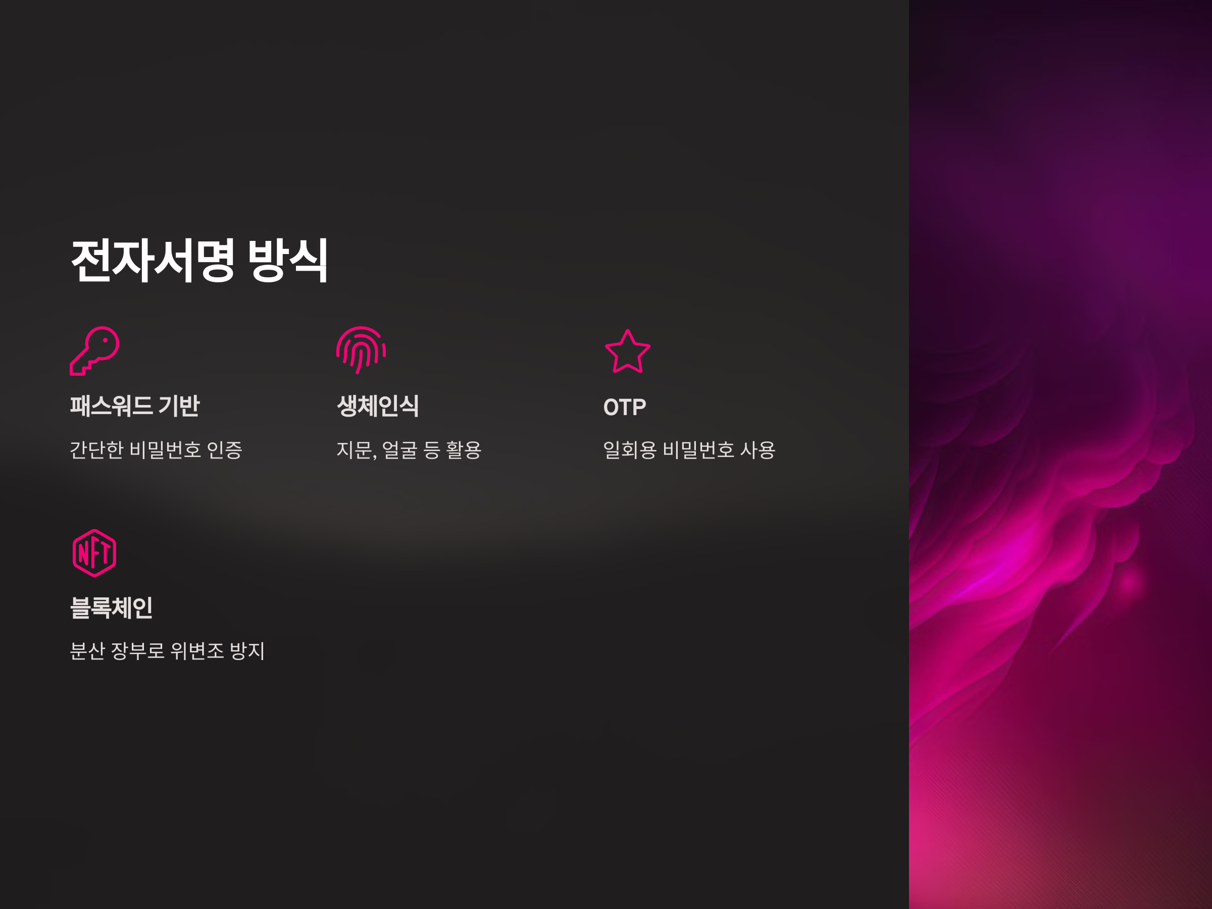 블록체인 기술을 기반으로 한 전자서명은 탈중앙화된 시스템에서 신뢰성을 보장하는 방법입니다. 블록체인은 거래의 모든 정보를 분산된 장부에 기록하기 때문에 위변조가 불가능하고, 모든 거래 내역이 안전하게 보호됩니다. 블록체인 기반의 전자서명은 금융 거래뿐만 아니라, 계약서 서명, 인증서 발급 등 다양한 분야에서 활용될 수 있습니다. 이 방법은 공인인증서를 대체할 수 있는 매우 혁신적인 기술로 주목받고 있습니다.