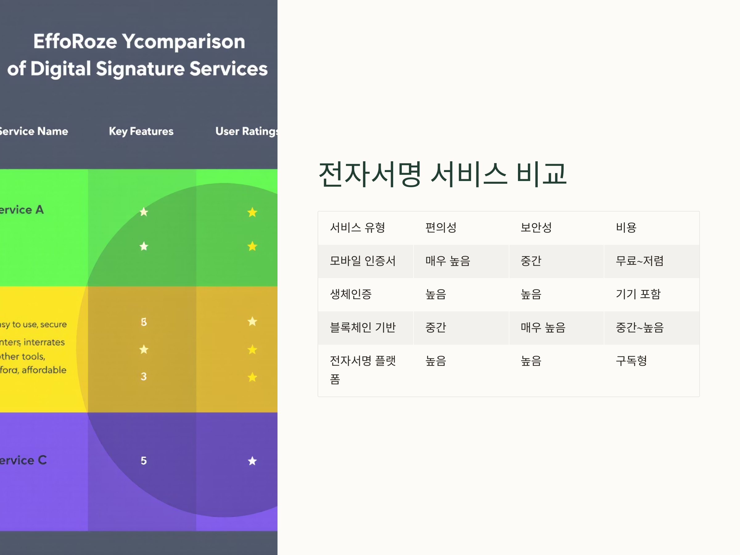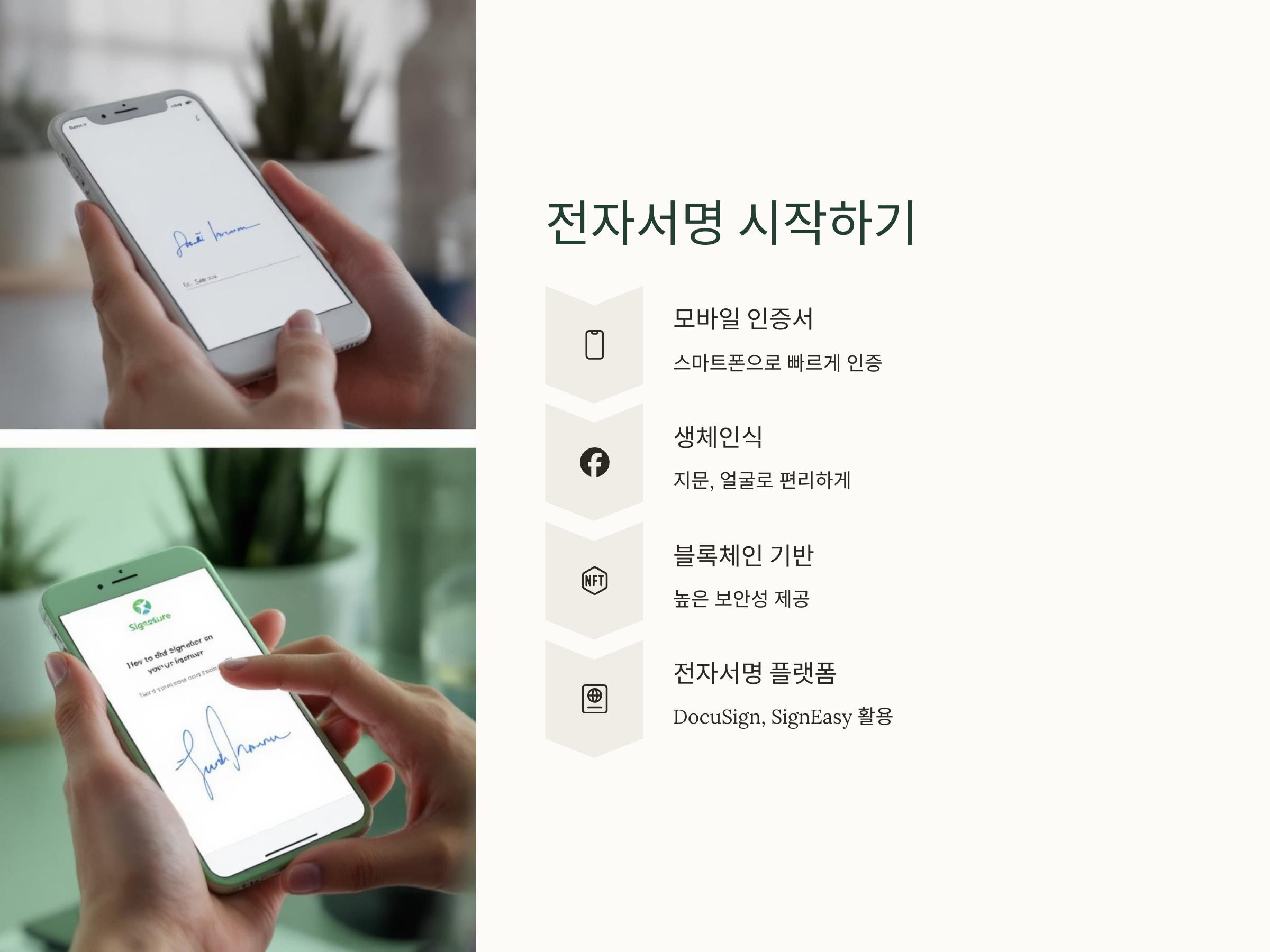 여러 전자서명 서비스 제공업체들이 등장하여, 각종 계약서 서명이나 공식 문서에 전자서명을 사용할 수 있게 도와줍니다. 대표적인 서비스로는 DocuSign, SignEasy 등이 있으며, 이들 서비스는 빠르고 안전하게 서명할 수 있는 시스템을 제공합니다.