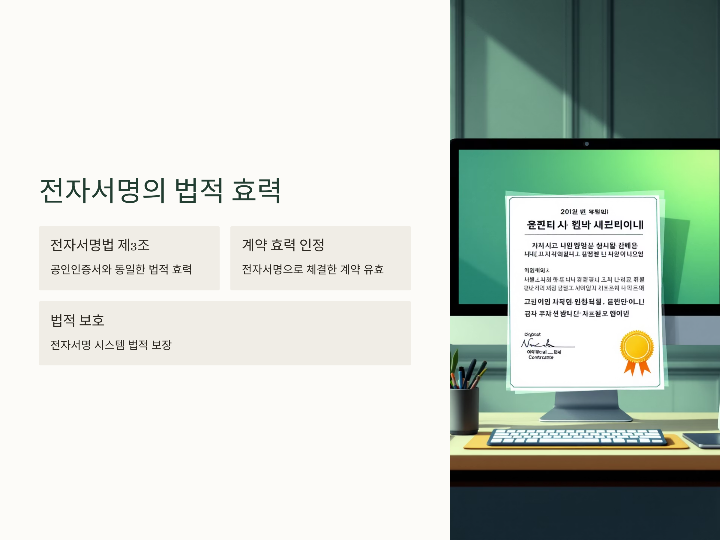 전자서명은 법적으로도 그 효력을 인정받고 있습니다. 특히 대한민국에서는 전자서명법에 따라, 전자서명도 공인인증서와 동일한 법적 효력을 가질 수 있도록 규정하고 있습니다.