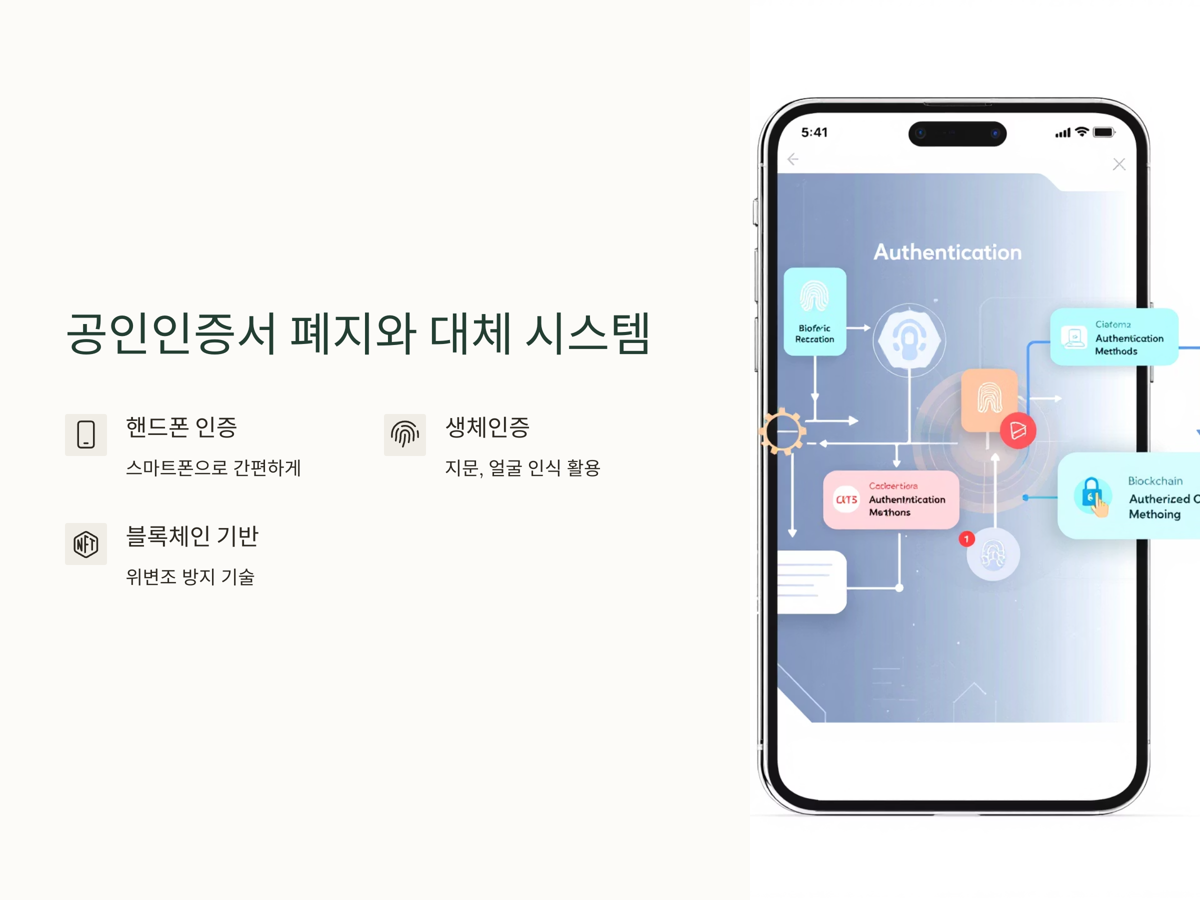 이 기술들은 공인인증서보다 훨씬 간편하고 직관적이어서 사용자 경험을 크게 향상시킬 수 있습니다. 예를 들어, 핸드폰 인증은 스마트폰만 있으면 바로 인증을 진행할 수 있으며, 생체인증은 그만큼 보안이 강화되면서도 매우 편리하게 이용할 수 있습니다.