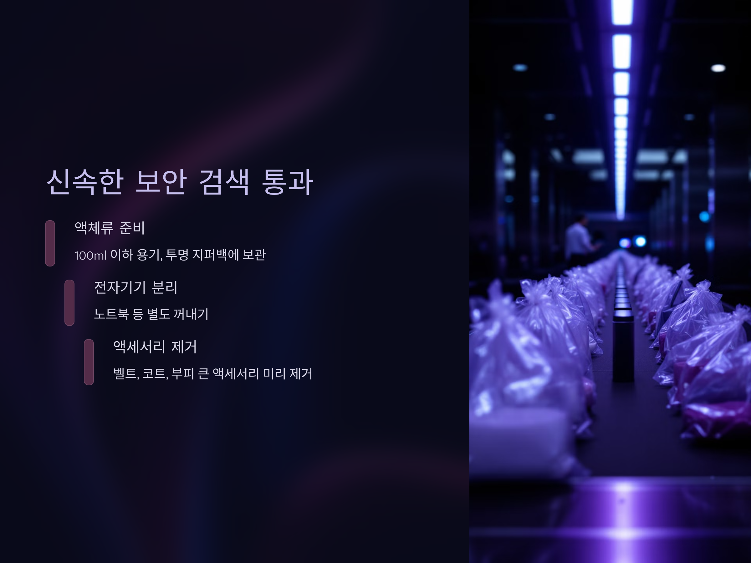 보안 검색에서 시간을 절약하려면 사전에 준비해야 합니다. 액체류는 100ml 이하 용기에 담아 투명한 지퍼백에 넣어야 하며, 노트북과 같은 전자기기는 별도로 꺼내야 합니다. 또한, 벨트, 코트, 부피가 큰 액세서리는 미리 제거하면 검색대에서 시간을 단축할 수 있습니다. 만약 우선 검색 서비스(Fast Track)를 제공하는 공항이라면, 이를 이용하는 것도 좋은 방법입니다.