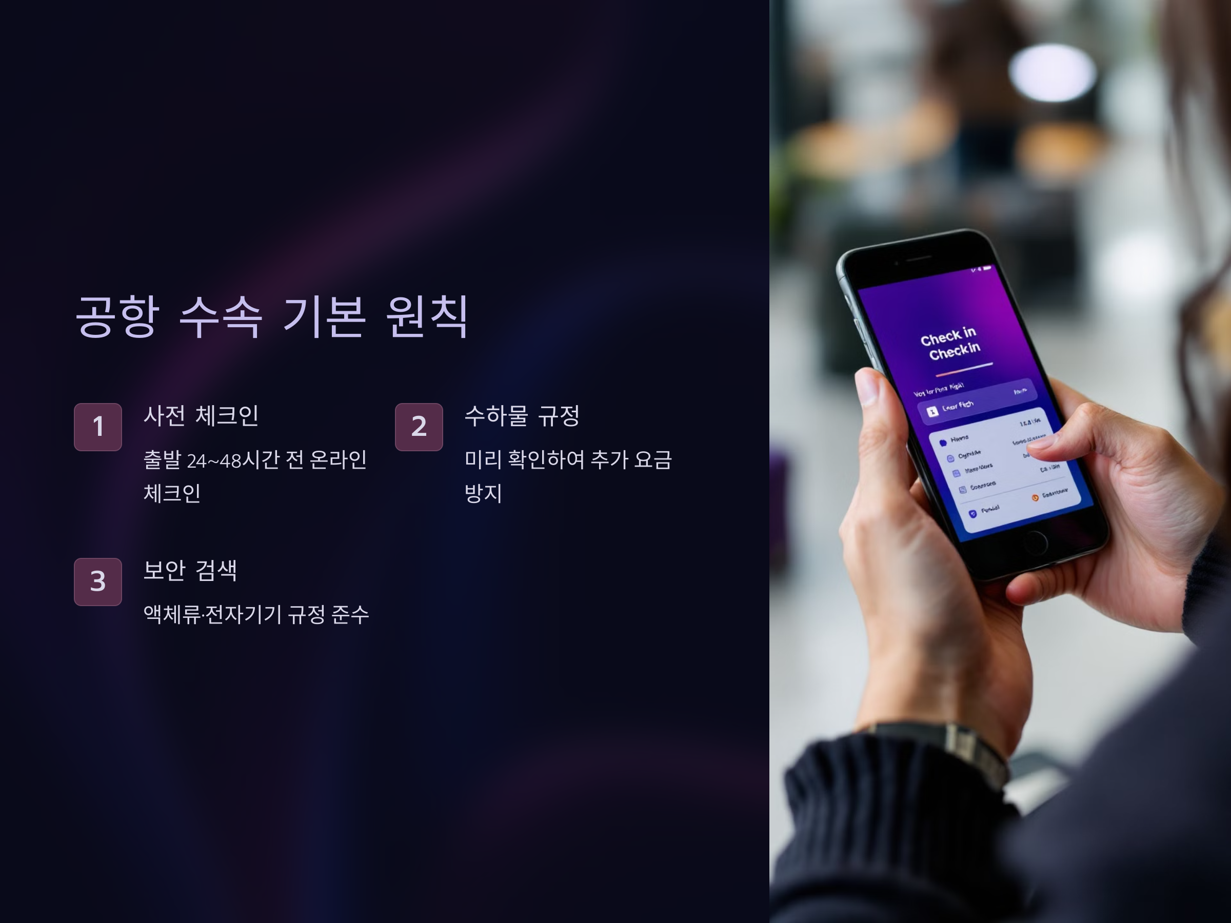 공항에서 시간을 절약하려면 몇 가지 핵심 원칙을 기억해야 합니다. 첫째, 사전 체크인을 활용하면 공항에서 대기하는 시간을 줄일 수 있습니다. 대부분의 항공사는 출발 24~48시간 전에 온라인 체크인을 지원하며, 이를 통해 공항에서 티켓을 발급받는 시간을 줄일 수 있습니다. 둘째, 수하물 규정을 미리 확인하여 추가 요금이나 수속 지연을 방지하는 것이 중요합니다. 셋째, 보안 검색을 빠르게 통과하려면 액체류 및 전자기기 규정을 준수하고, 쉽게 꺼낼 수 있도록 준비하는 것이 좋습니다.