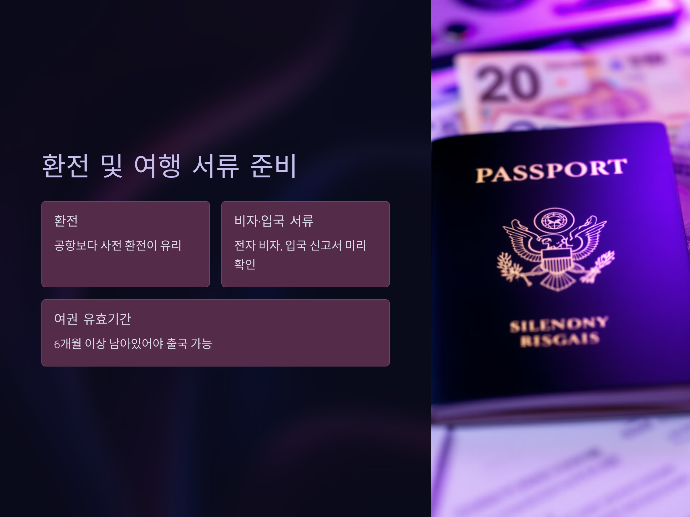 해외 여행을 떠날 경우, 환전과 비자, 여권을 미리 준비하는 것이 중요합니다. 공항에서 환전하면 환율이 좋지 않기 때문에 사전에 환전하는 것이 유리합니다. 또한, 일부 국가에서는 전자 비자(e-Visa)나 입국 신고서 등의 서류가 필요할 수 있으므로 이를 미리 확인해야 합니다. 여권 유효 기간이 6개월 이상 남아 있어야 출국이 가능하므로 출발 전에 점검하는 것이 필수입니다.