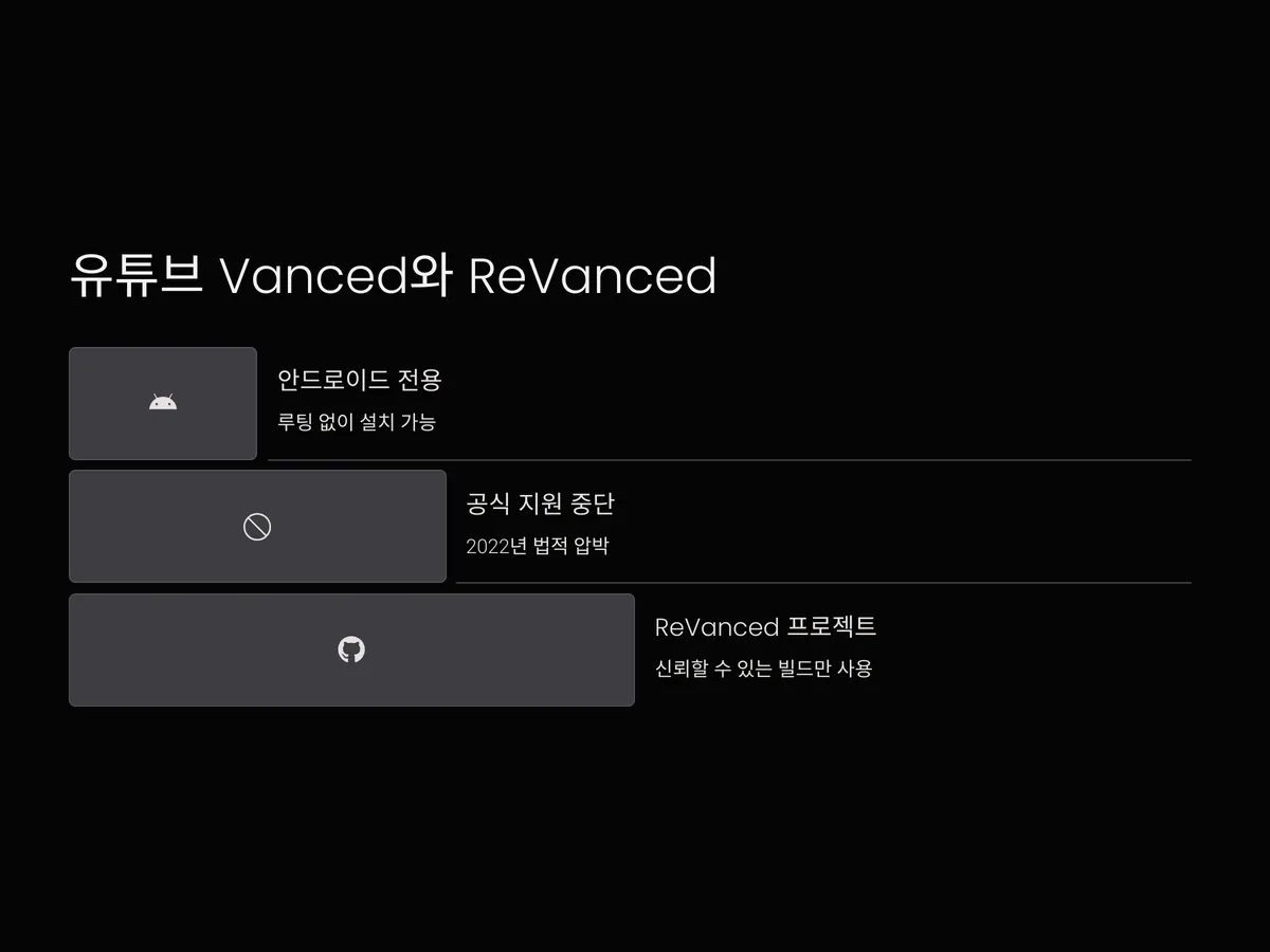 유튜브 Vanced는 한때 가장 인기 있는 광고 차단 앱이었지만, 2022년 구글의 법적 압박으로 공식 지원이 중단되었습니다. 그럼에도 불구하고 ReVanced 프로젝트로 이어져 여전히 많은 사용자가 이용하고 있습니다.