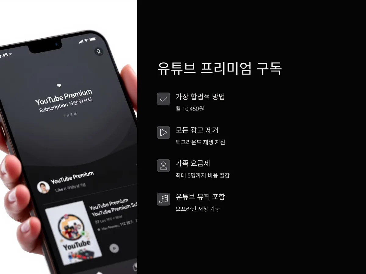 유튜브 프리미엄은 구글이 공식적으로 제공하는 유료 서비스로, 광고 없이 유튜브를 이용할 수 있는 가장 확실한 방법입니다. 월 10,450원의 요금이 부담스러울 수 있지만, 다음과 같은 혜택이 있습니다: