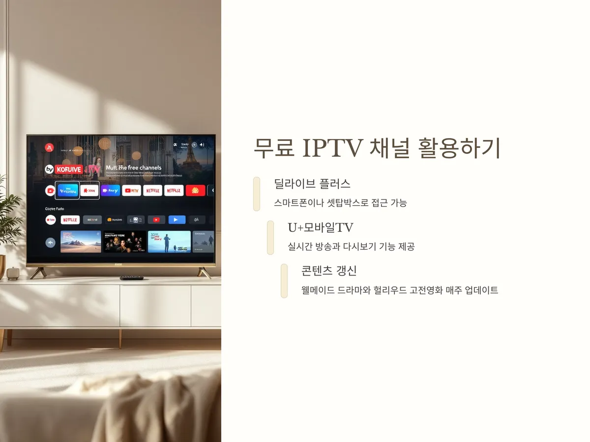 딜라이브 플러스나 U+모바일TV 등은 스마트폰 또는 셋탑박스를 통해 접근 가능한 무료 IPTV 채널을 운영합니다. 실시간 방송은 물론, 다시보기 기능을 통해 방송된 드라마와 영화도 다시 볼 수 있으며, 일부 채널은 VOD로도 구성되어 있어 편리합니다. 특히 최근에는 웰메이드 드라마와 시트콤, 그리고 헐리우드 고전영화를 포함한 다양한 라인업이 매주 갱신되고 있어 콘텐츠의 질도 상승하고 있습니다.