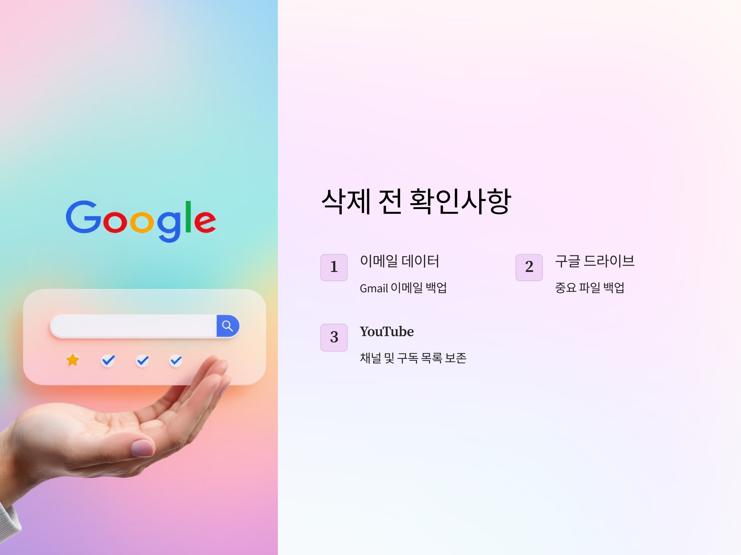 - YouTube: 유튜브 채널과 구독한 콘텐츠도 삭제됩니다. 동영상 업로드나 구독 목록을 보존하려면 백업이 필요합니다.