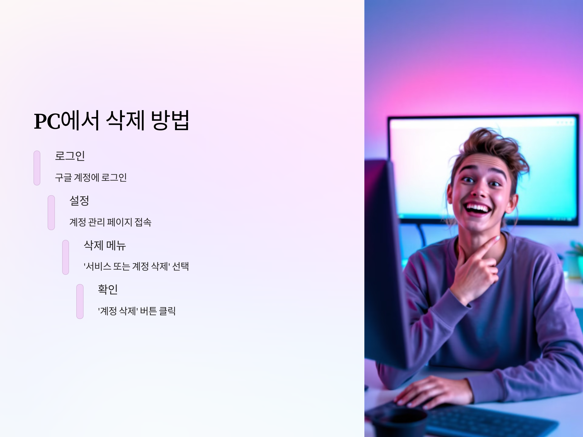 구글 계정 삭제는 모바일과 PC에서 모두 가능합니다. 하지만 가장 일반적인 방법은 PC를 통한 계정 삭제입니다. PC에서 구글 계정을 삭제하는 과정은 비교적 간단합니다. 아래 단계를 따라 해보세요.