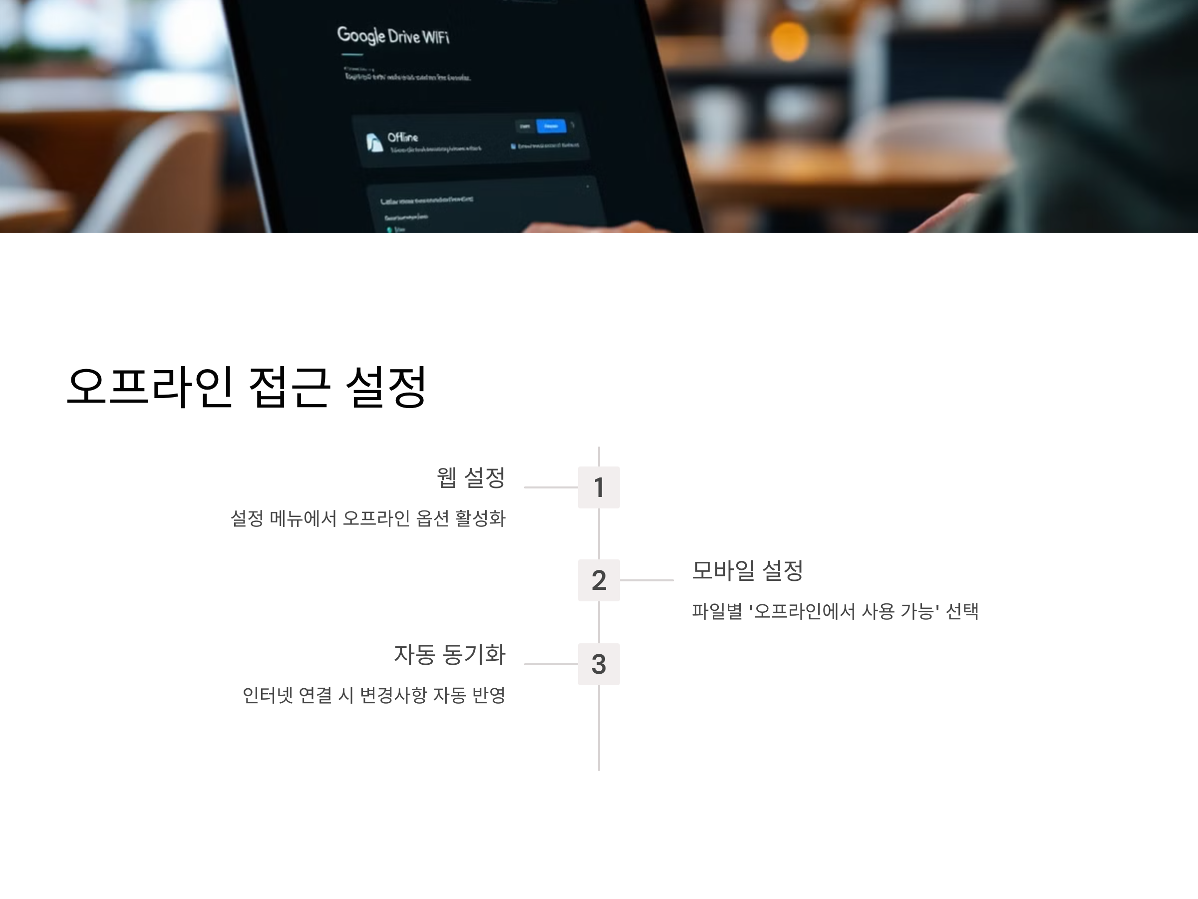 구글 드라이브는 인터넷이 없는 상황에서도 파일을 열람하고 편집할 수 있는 오프라인 기능을 제공합니다. 이를 설정하려면: