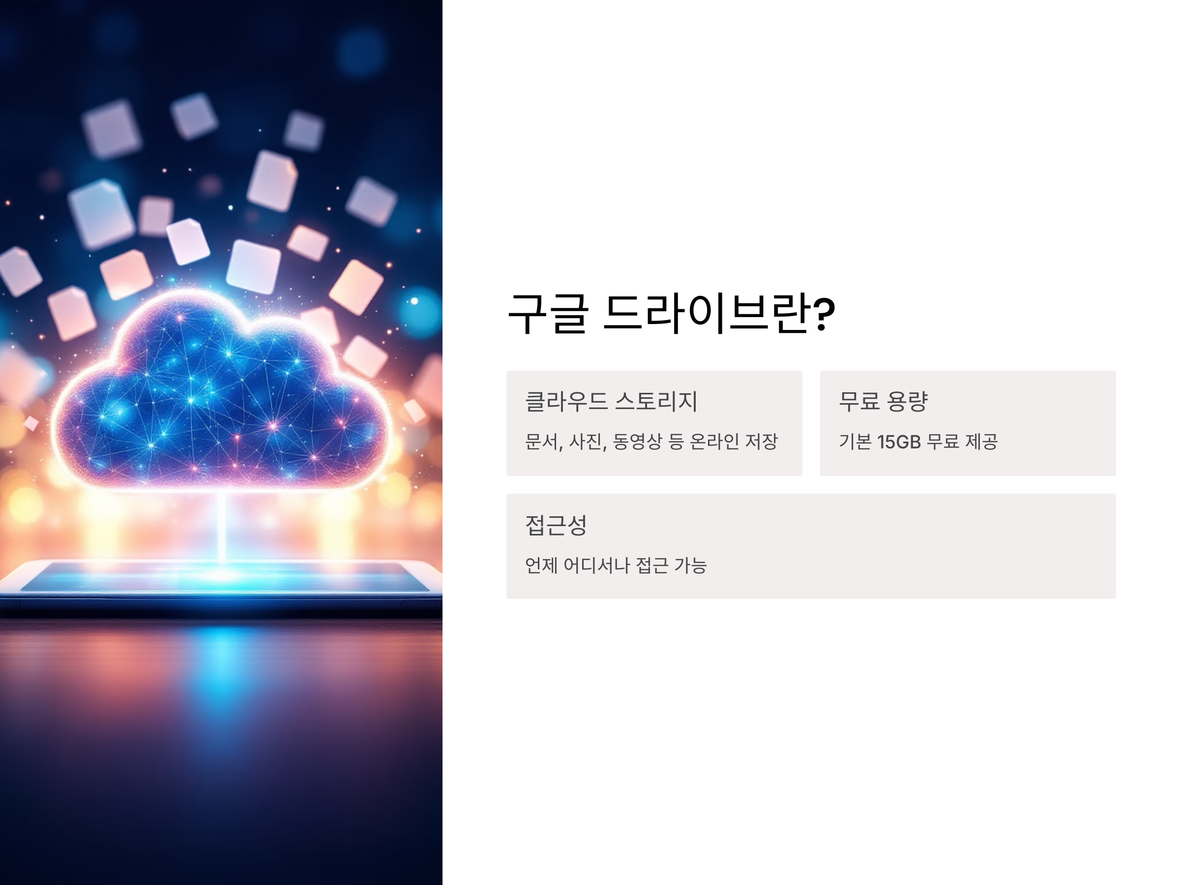 구글 드라이브는 구글에서 제공하는 클라우드 스토리지 서비스로, 사용자가 문서, 사진, 동영상 등 다양한 파일을 온라인에 안전하게 저장하고, 언제 어디서나 접근할 수 있도록 도와줍니다. 기본적으로 15GB의 무료 저장 공간을 제공하며, 추가 용량은 유료로 확장 가능합니다. 이를 통해 개인 사용자부터 기업까지 다양한 용도로 활용할 수 있습니다.