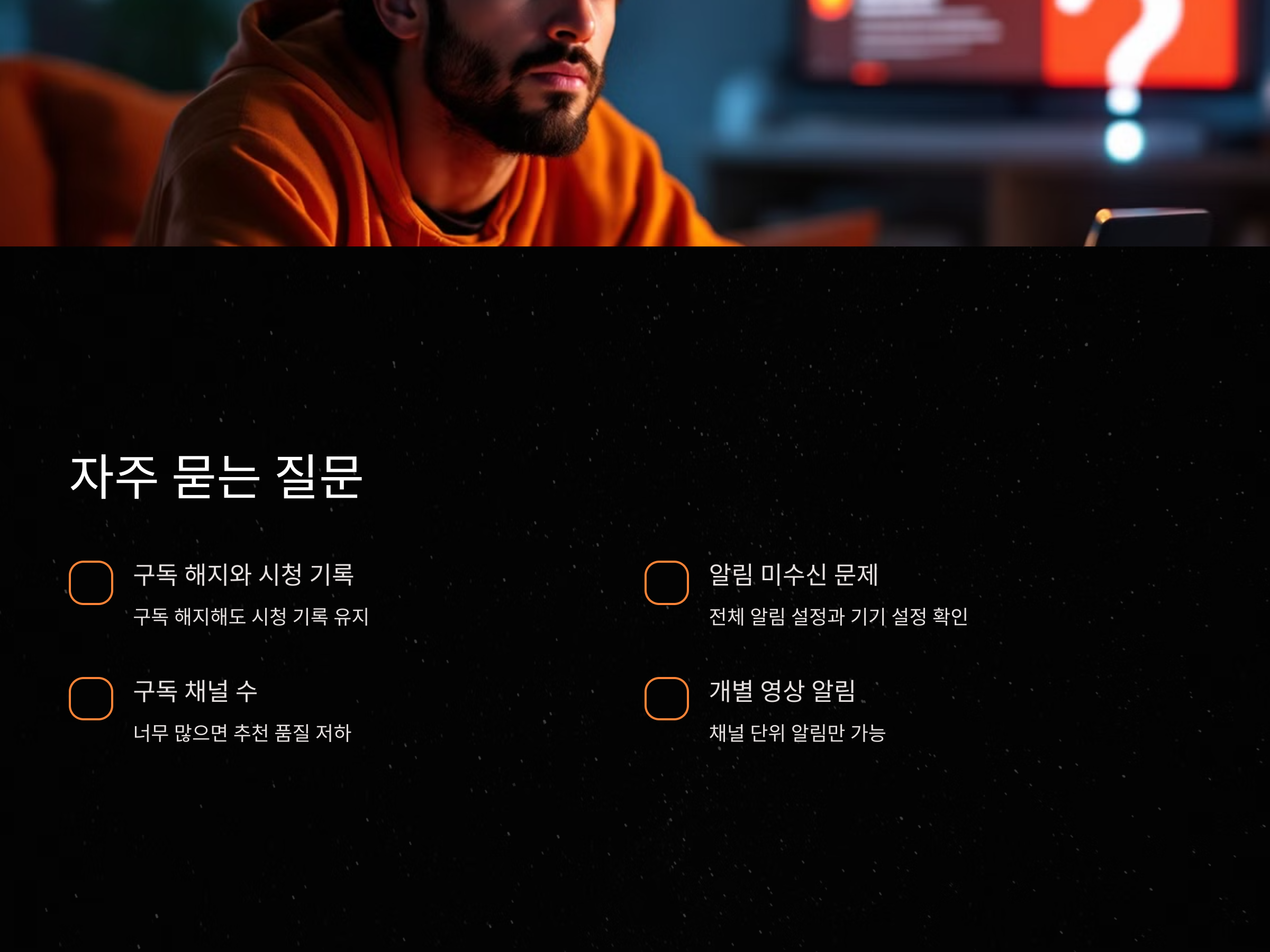 A. 아닙니다. 구독은 채널을 팔로우하는 개념이며, 시청 기록은 별도로 저장됩니다. 구독 해지 후에도 과거 시청한 영상은 기록에 남습니다.
