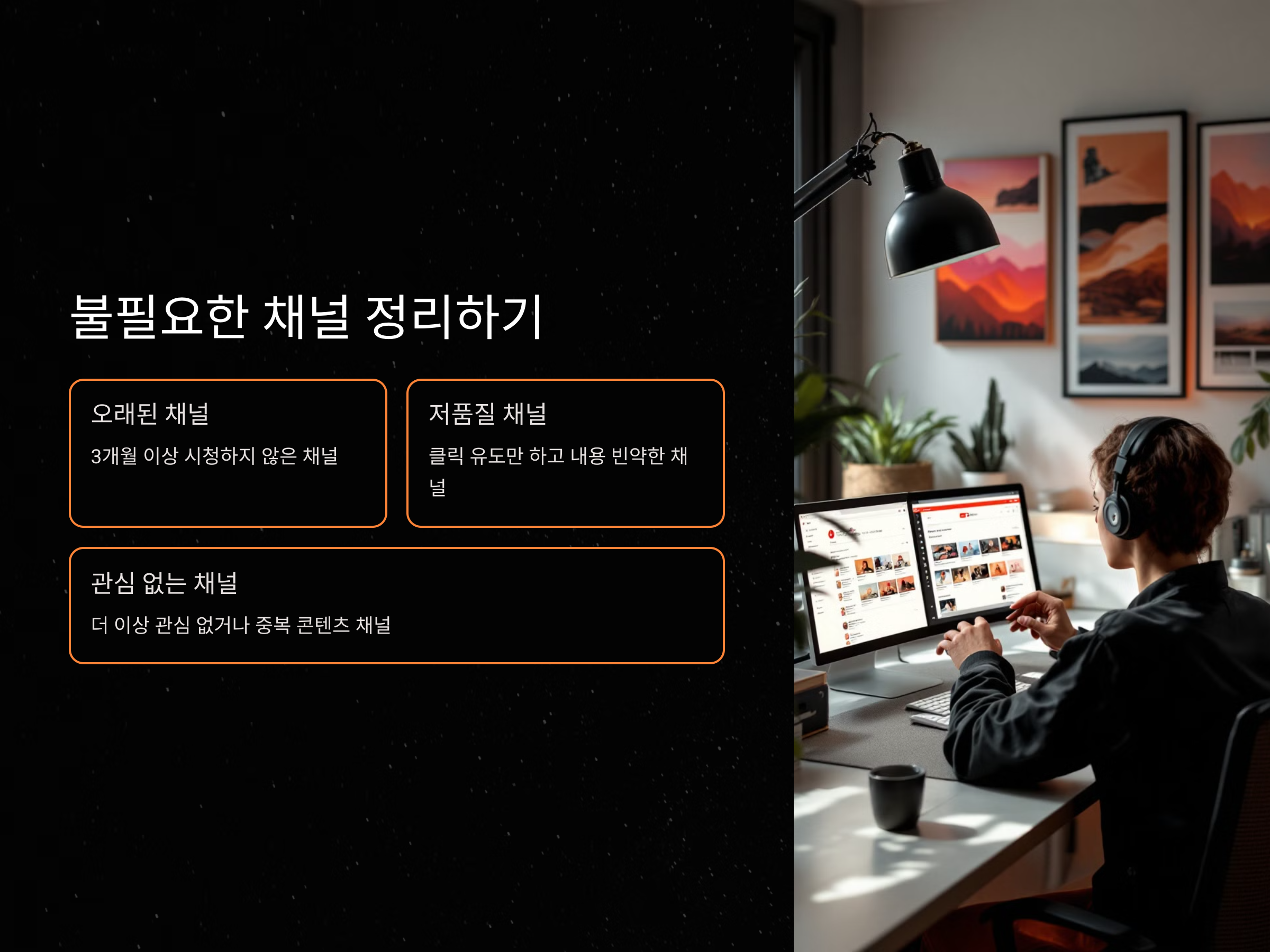 구독 채널이 많아질수록 유튜브 알고리즘이 제공하는 영상 추천의 품질이 떨어질 수 있습니다. 이는 사용자가 실제로 관심 없는 영상도 피드에 노출되게 만들기 때문이죠. 따라서 주기적인 구독 채널 정리는 필수입니다.