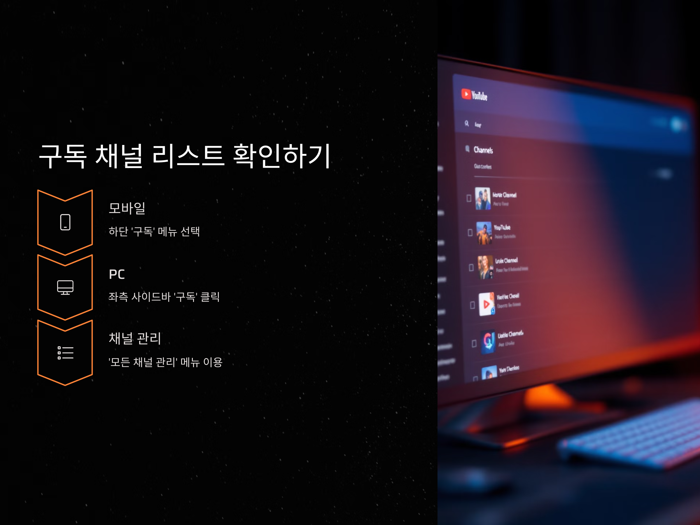 PC에서는 좌측 사이드바에서 ‘구독’을 클릭한 후 상단의 ‘모든 채널 관리’ 메뉴로 들어가면 전체 구독 채널이 목록으로 나타납니다. 이곳에서는 채널마다 알림 설정 상태, 구독 유지 여부, 채널 정렬 등을 직관적으로 확인할 수 있어 매우 유용합니다. 채널 정리가 필요할 경우, 오래된 채널이나 더 이상 관심 없는 채널은 구독 해지로 간단히 관리할 수 있습니다.