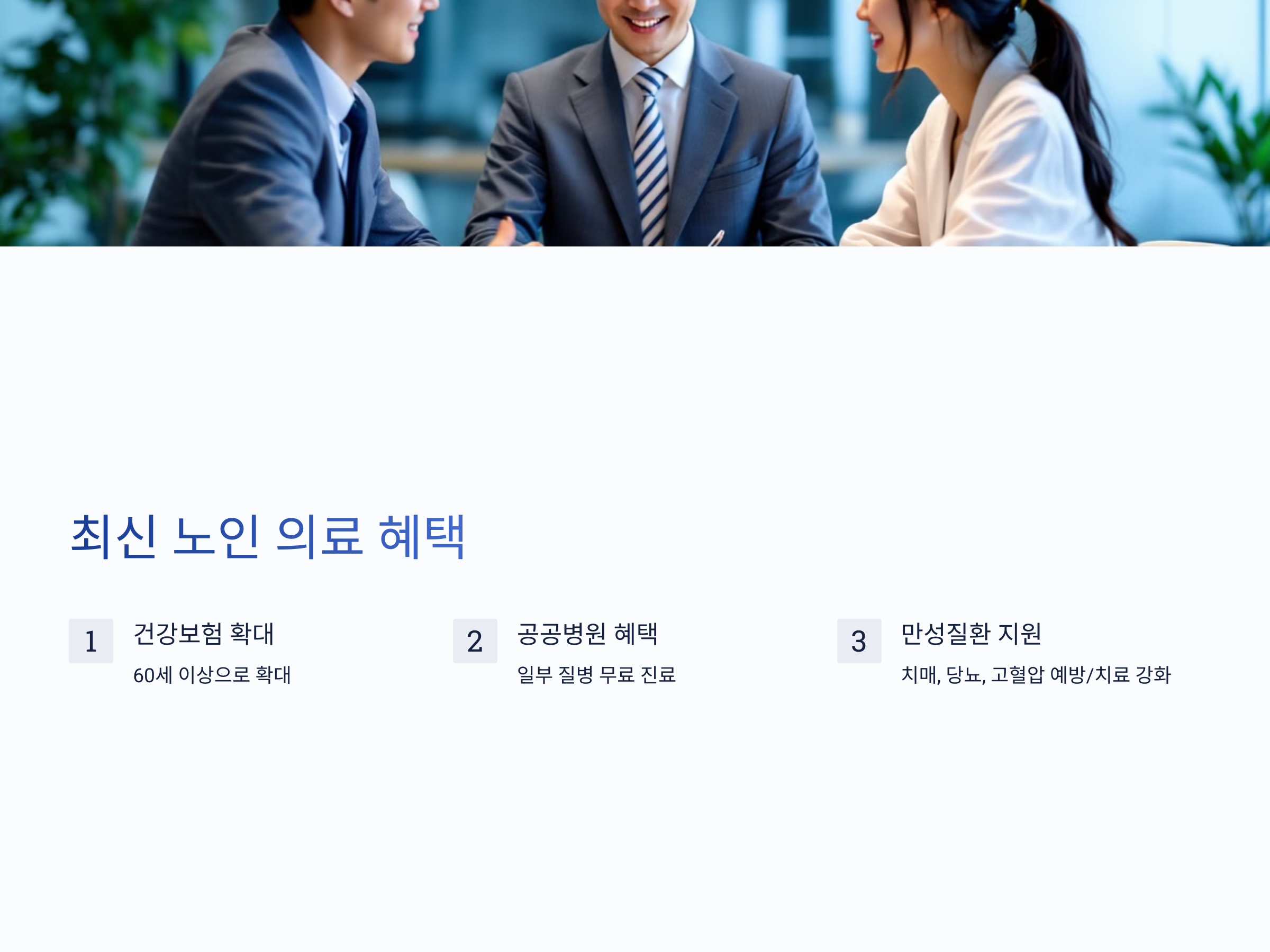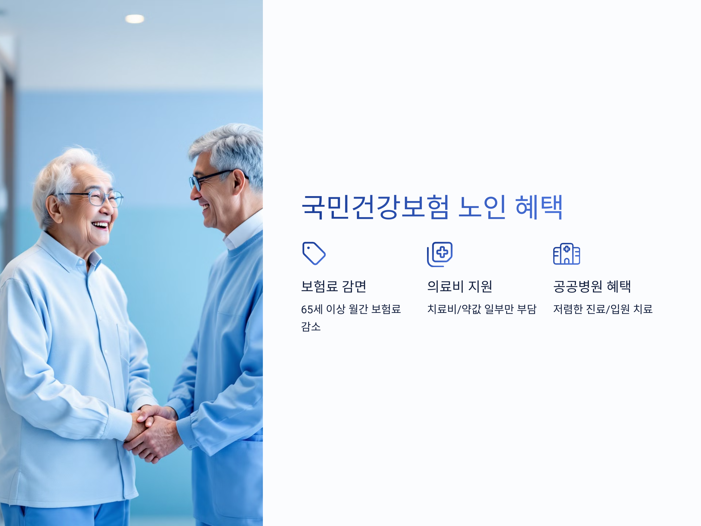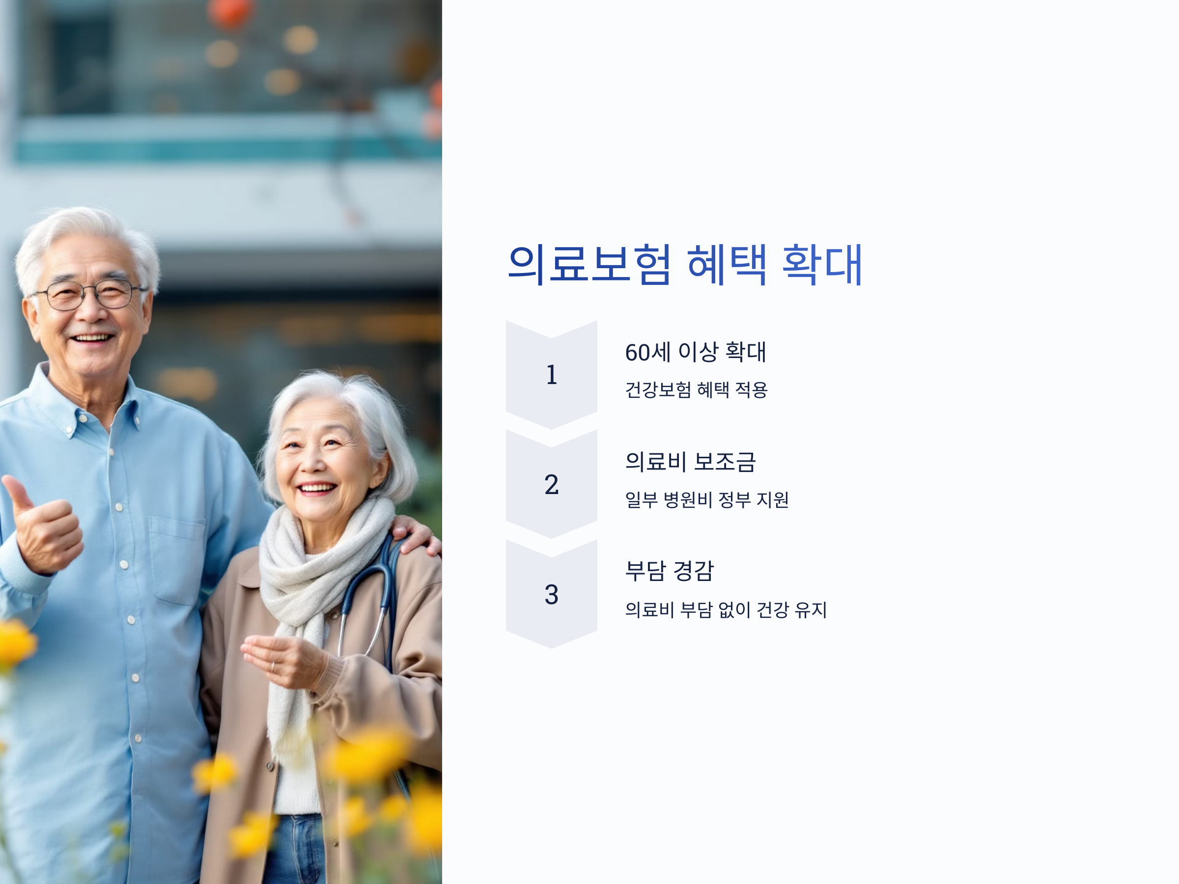 - 60세 이상 의료 혜택 확대: 60세 이상의 노인들에게도 확대된 건강보험 혜택을 적용하여 의료비를 절감할 수 있습니다.