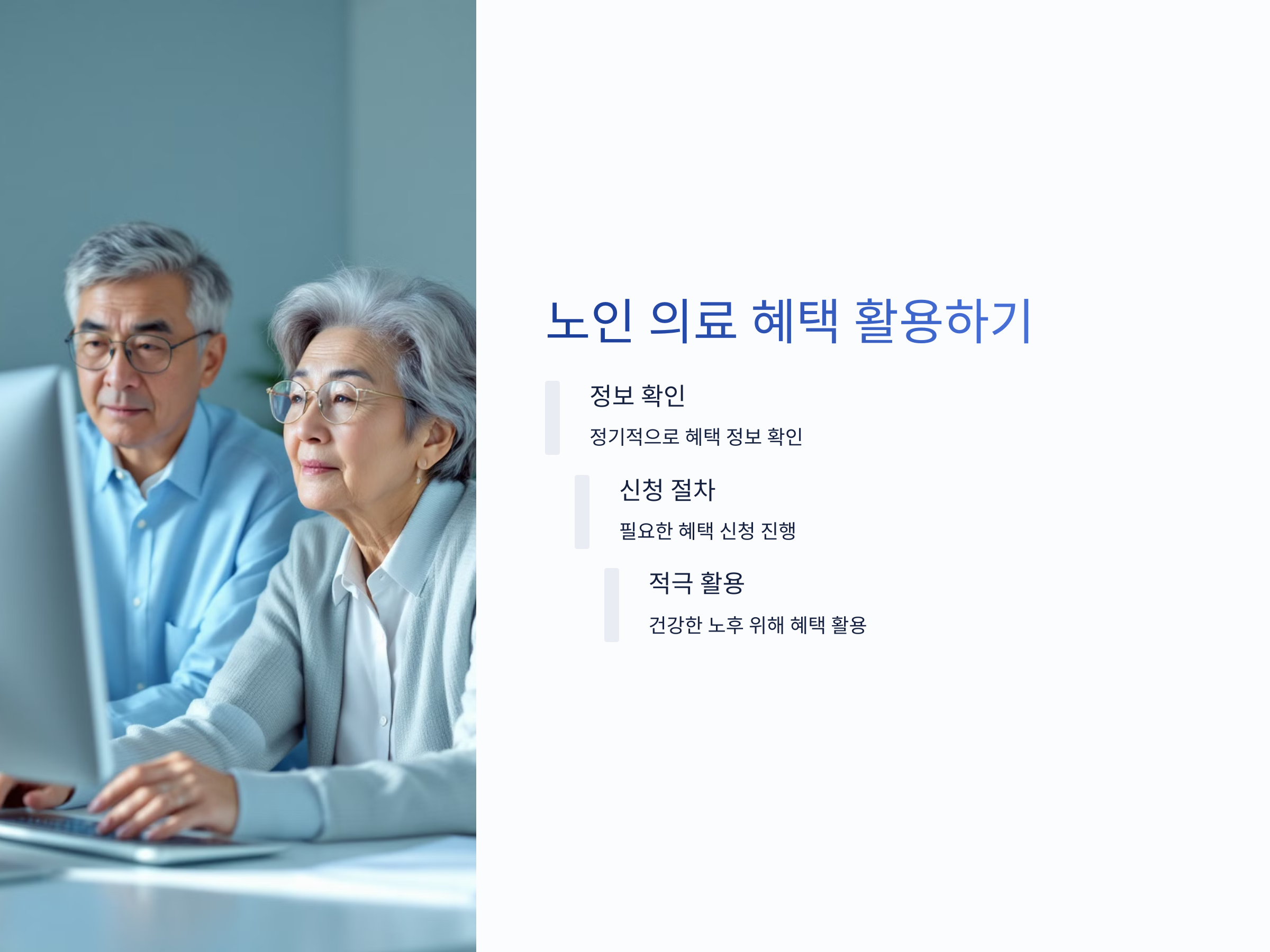 노후를 건강하게 보내기 위해서는, 지금 당장 노인 의료 혜택에 대해 정확히 알아보고 적극적으로 활용하는 것이 무엇보다 중요합니다. 여러분의 건강한 노후를 위해 지금 바로 필요한 혜택을 챙기세요!