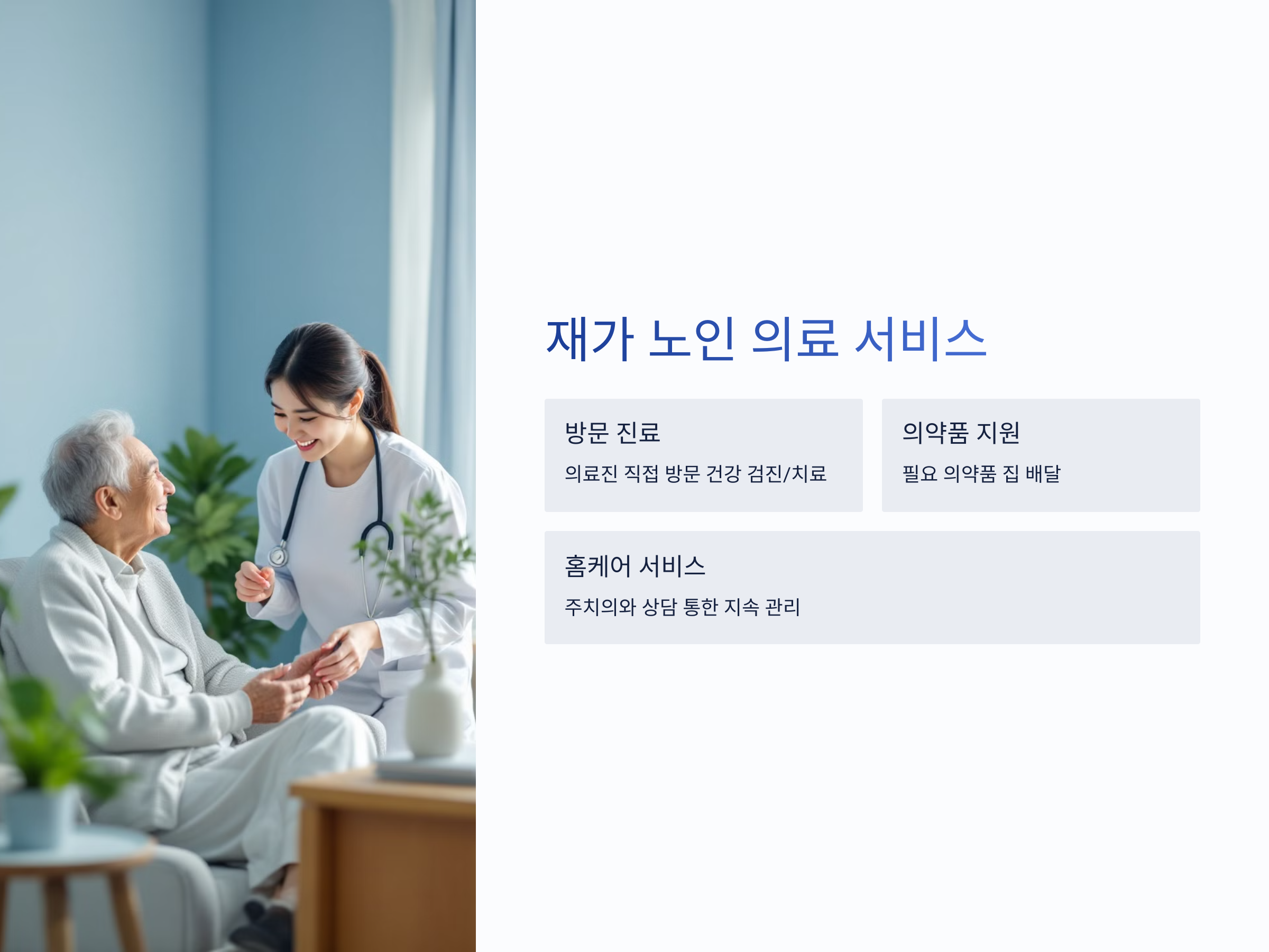 재가 노인 의료 지원 서비스는 병원에 가기 힘든 거동 불편한 노인들을 위한 서비스로, 병원이 아닌 집에서 의료 서비스를 받을 수 있도록 지원합니다. 이를 통해 노인은 이동의 불편함 없이 의료 서비스를 편리하게 받을 수 있습니다. 주요 내용은 다음과 같습니다.