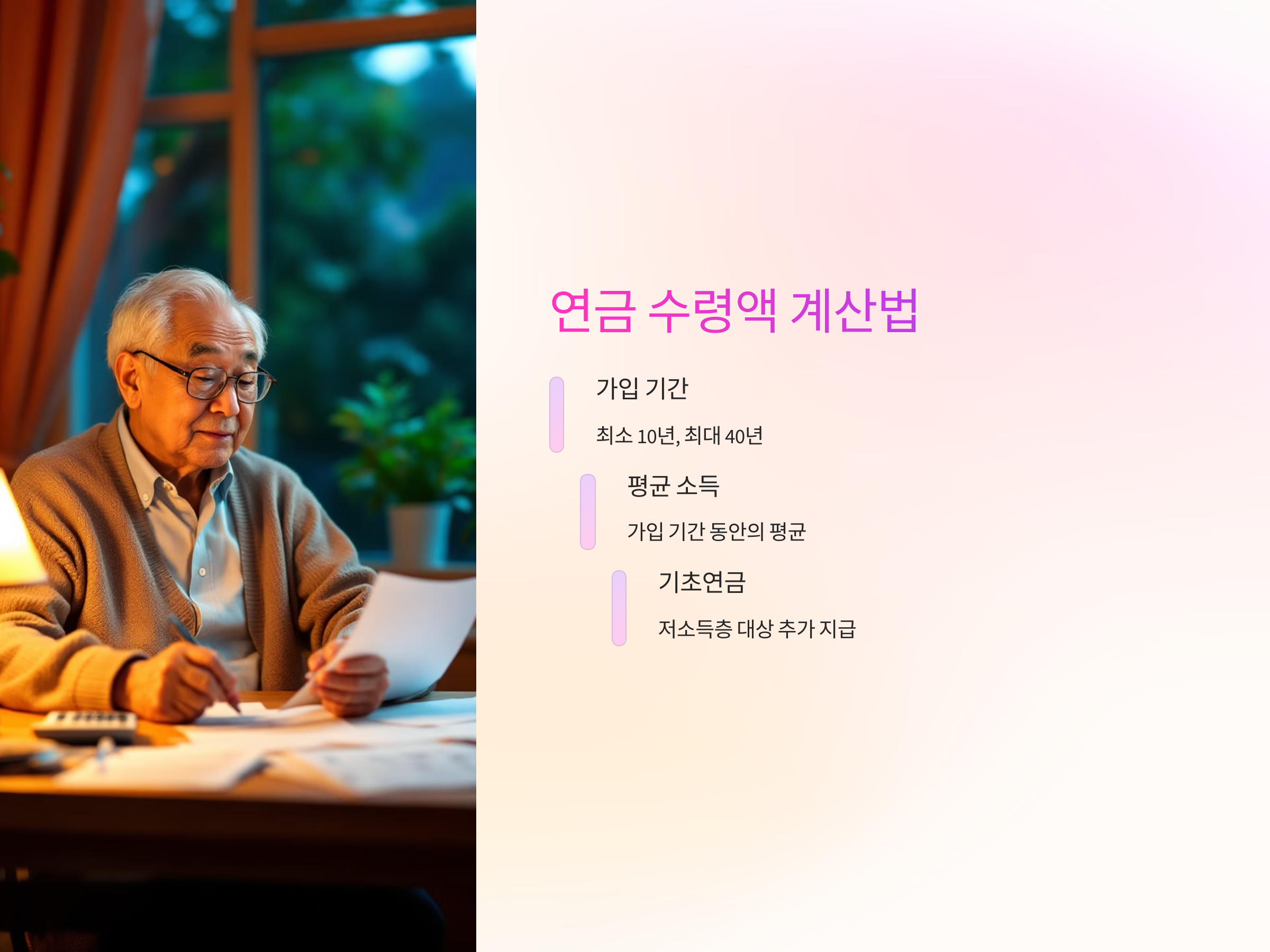 - 평균 소득: 가입 기간 동안 평균 소득을 기반으로 연금액이 결정됩니다.