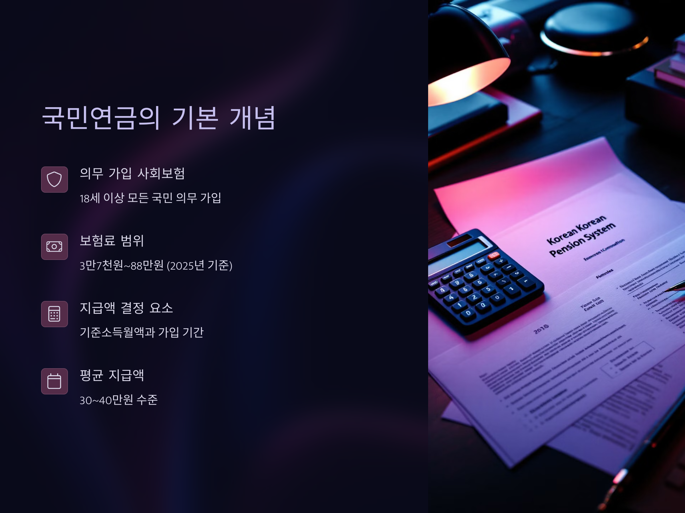 국민연금은 18세 이상의 모든 국민이 의무적으로 가입해야 하는 사회보험 제도입니다. 매달 일정한 보험료를 납부하며, 60세 이상이 되었을 때 일정한 연금을 받게 됩니다. 국민연금의 지급액은 주로 납입액과 납입 기간에 따라 다르게 결정됩니다. 현재 2025년 기준으로 최소 3만 7천 원에서 최대 88만 원의 보험료가 부과되며, 연금 지급액은 평균 30~40만 원 정도가 예상됩니다.