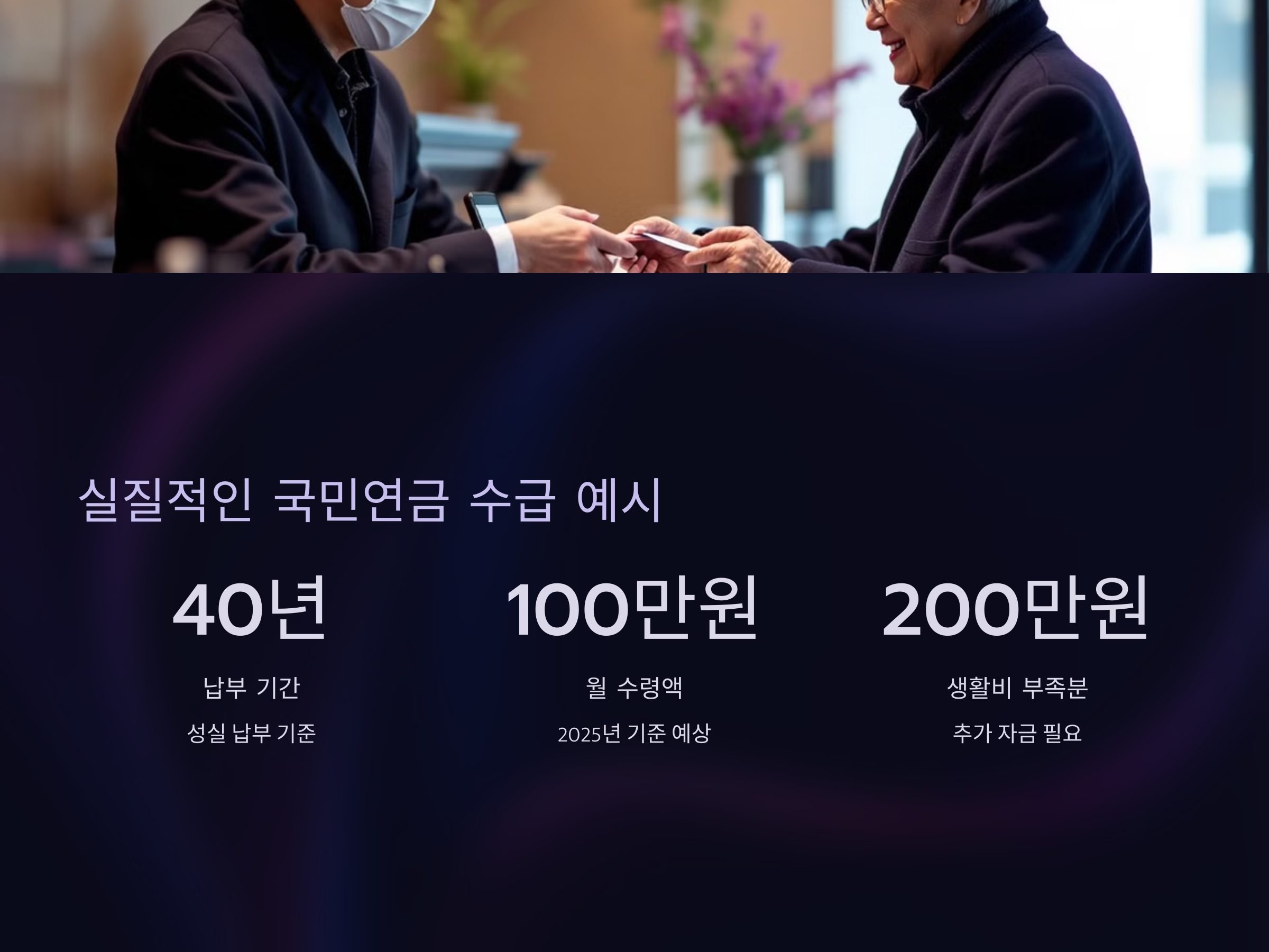 실제 국민연금 수급을 받는 사람들의 사례를 통해 좀 더 구체적으로 살펴보겠습니다. 2025년 기준으로, 40년간 성실히 보험료를 납부한 사람은 월 100만 원 정도의 연금을 받을 수 있습니다. 이는 기본적인 생활비와 주거비를 제외한 여유 자금이 부족할 수 있음을 의미합니다.