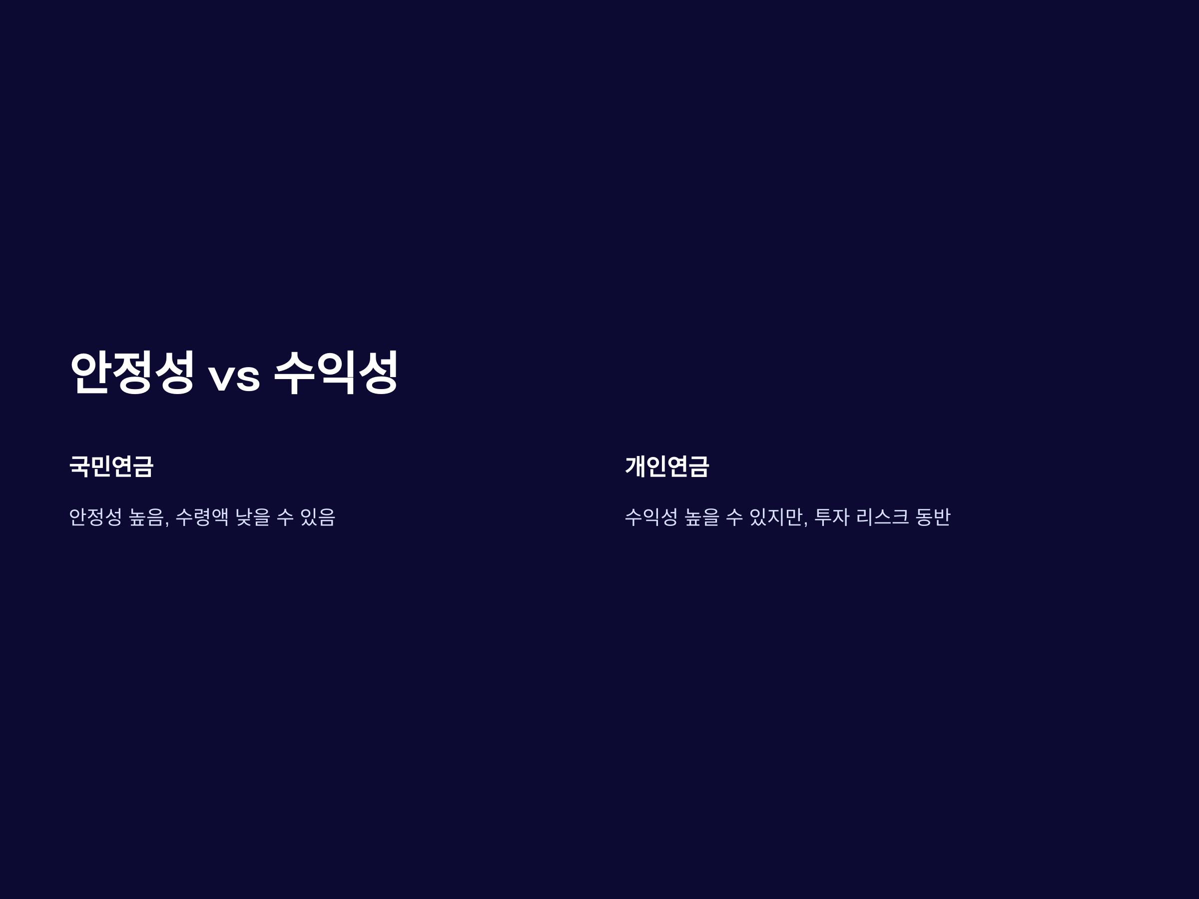 단기적인 안정성과 장기적인 수익성을 모두 고려해야 한다면, 국민연금과 개인연금을 함께 활용하는 것이 가장 유리한 전략입니다. 국민연금은 기본적인 안정적인 소득 보장을 제공하며, 개인연금은 추가적인 재정적 자립을 위한 좋은 도구가 될 수 있습니다.