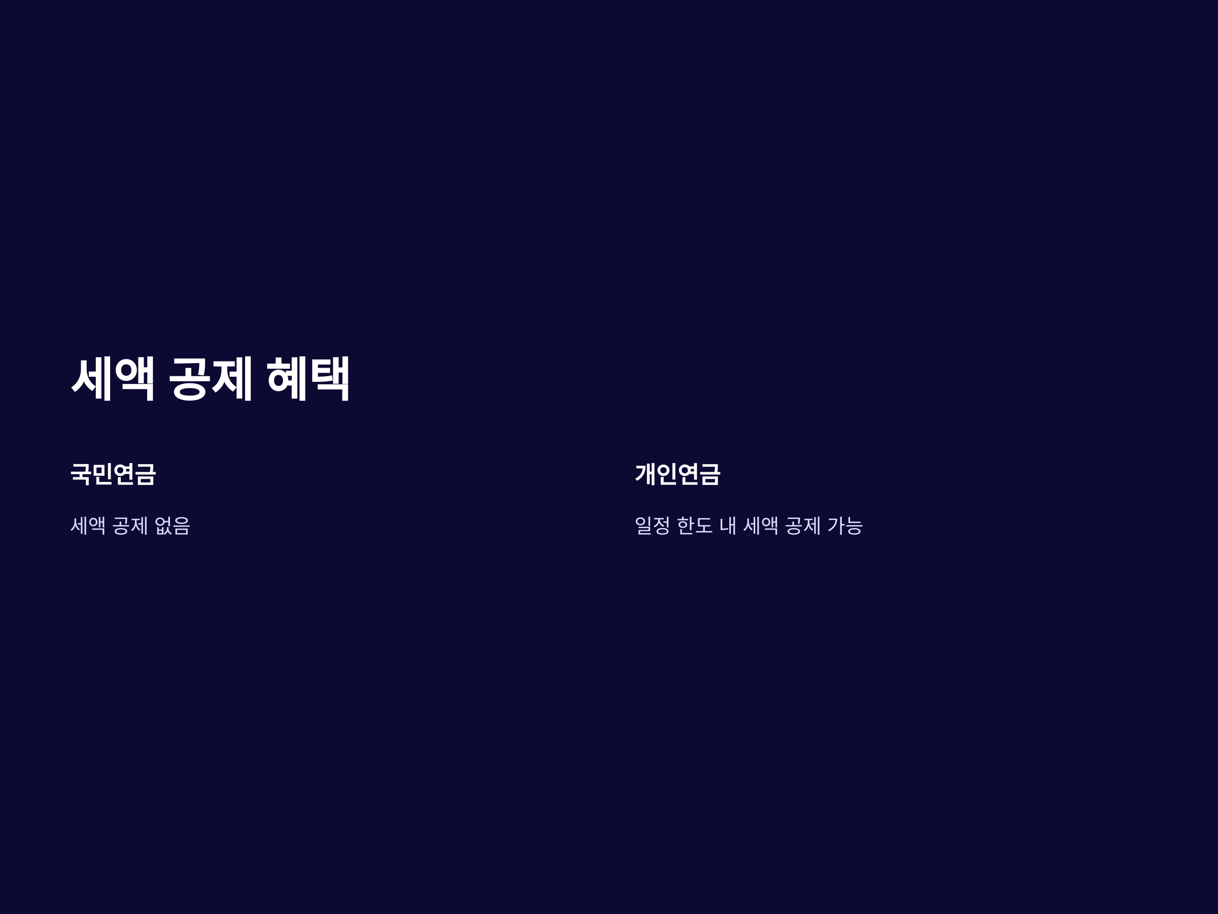 - 국민연금은 세액 공제가 없지만, 개인연금은 일정 한도 내에서 세액 공제를 받을 수 있어 세금 혜택이 있을 수 있습니다.