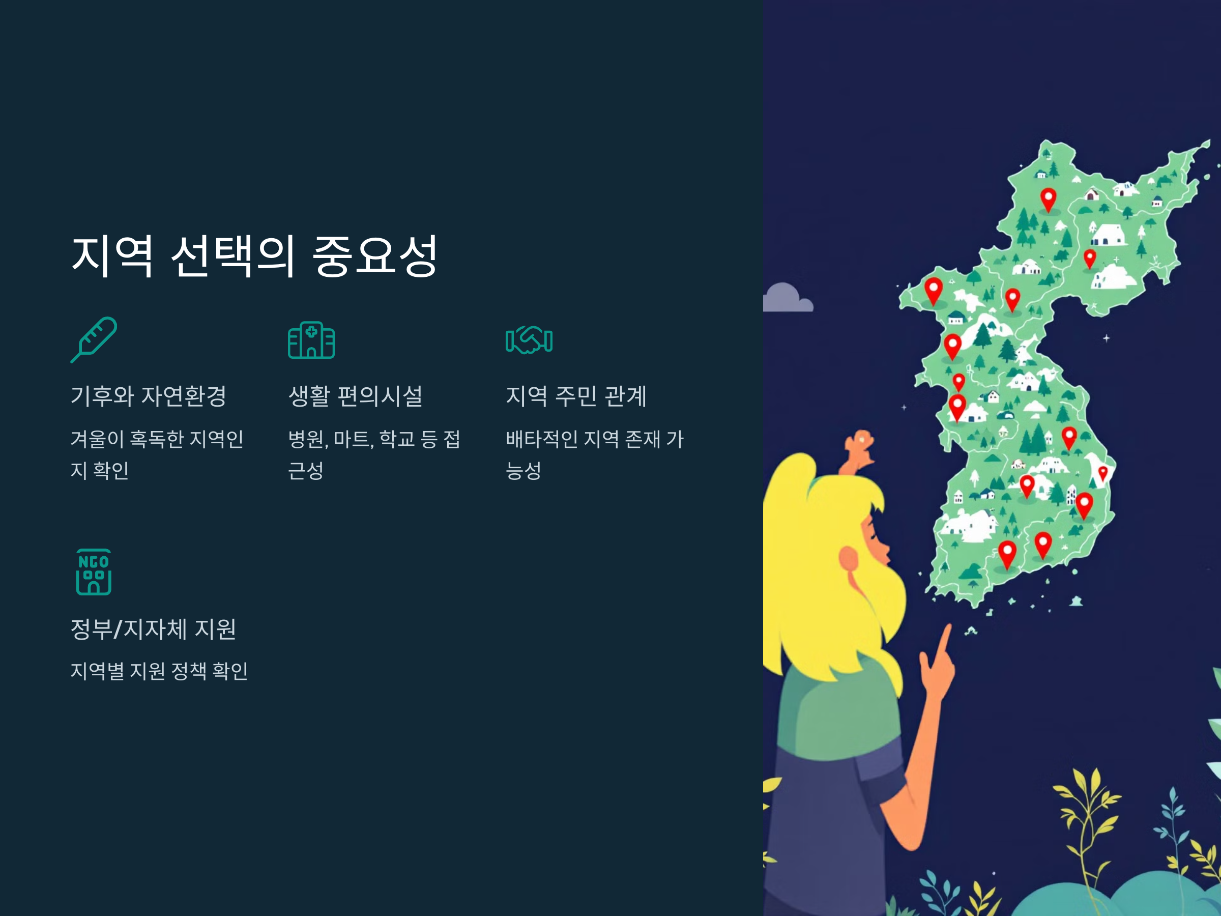 귀촌할 지역을 정하는 것은 매우 중요한 결정 요소입니다.
