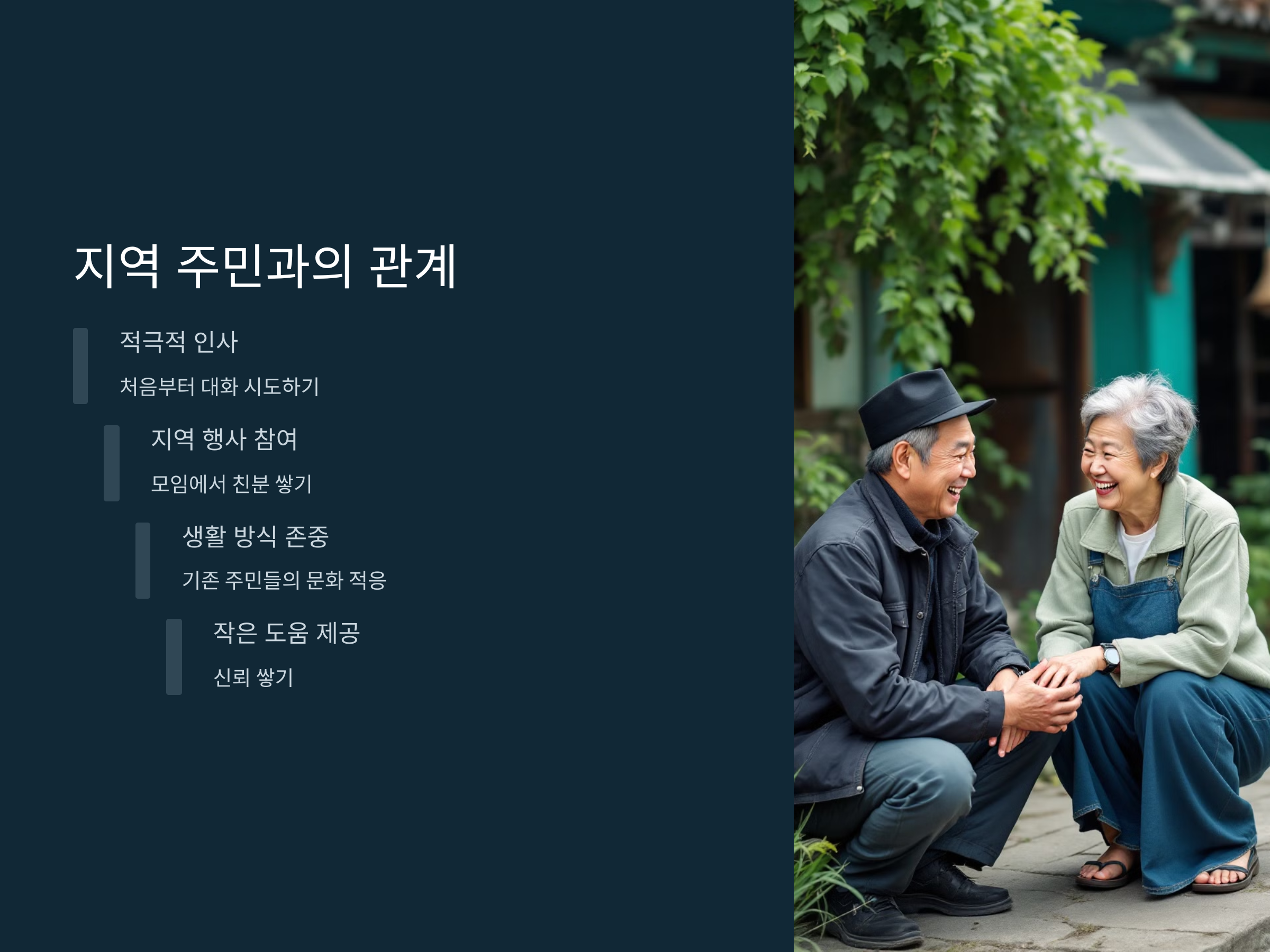 귀촌 생활에서 가장 중요한 것은 지역 주민들과의 원만한 관계입니다. 도시와 달리 시골에서는 이웃과의 관계가 더욱 중요해집니다.