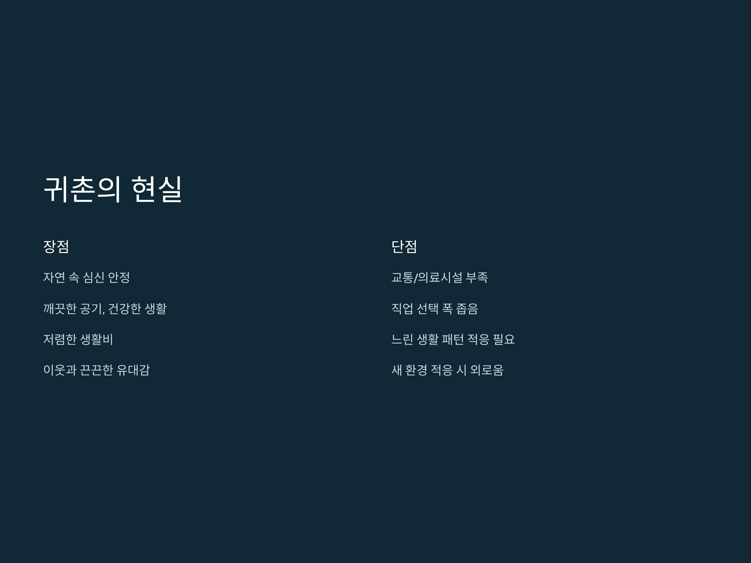 이러한 현실을 충분히 고려하고 나서야 귀촌을 결정하는 것이 바람직합니다.