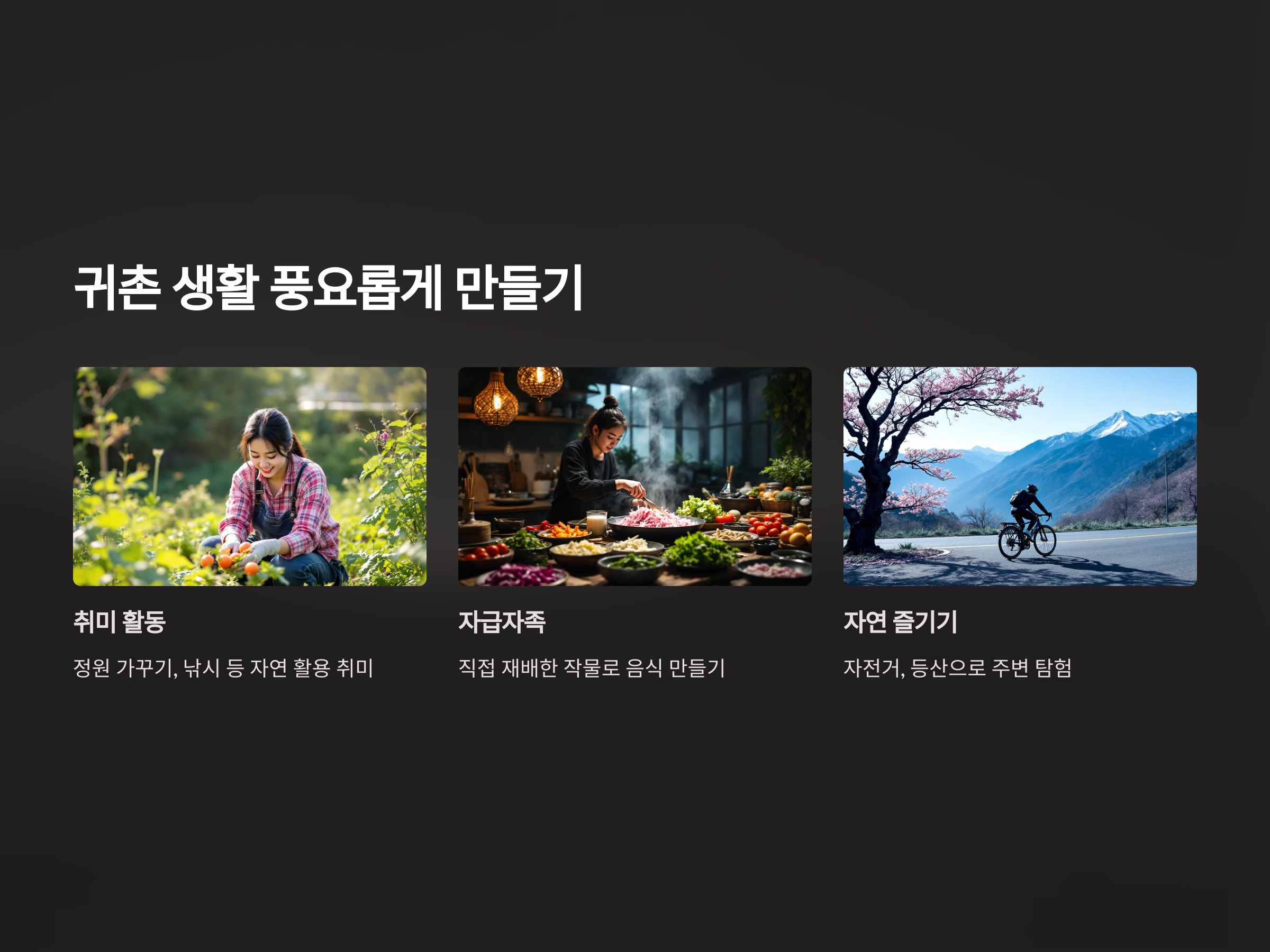 시골에서의 삶은 도시와는 다른 여유로운 분위기를 제공하기 때문에, 새로운 취미나 활동을 시작하기에 좋은 환경입니다. 예를 들어, 정원 가꾸기나 자전거 타기, 낚시 등의 활동은 귀촌 후 즐길 수 있는 취미들입니다. 이러한 활동들은 귀촌 생활을 더 풍요롭고 보람차게 만들어줍니다.