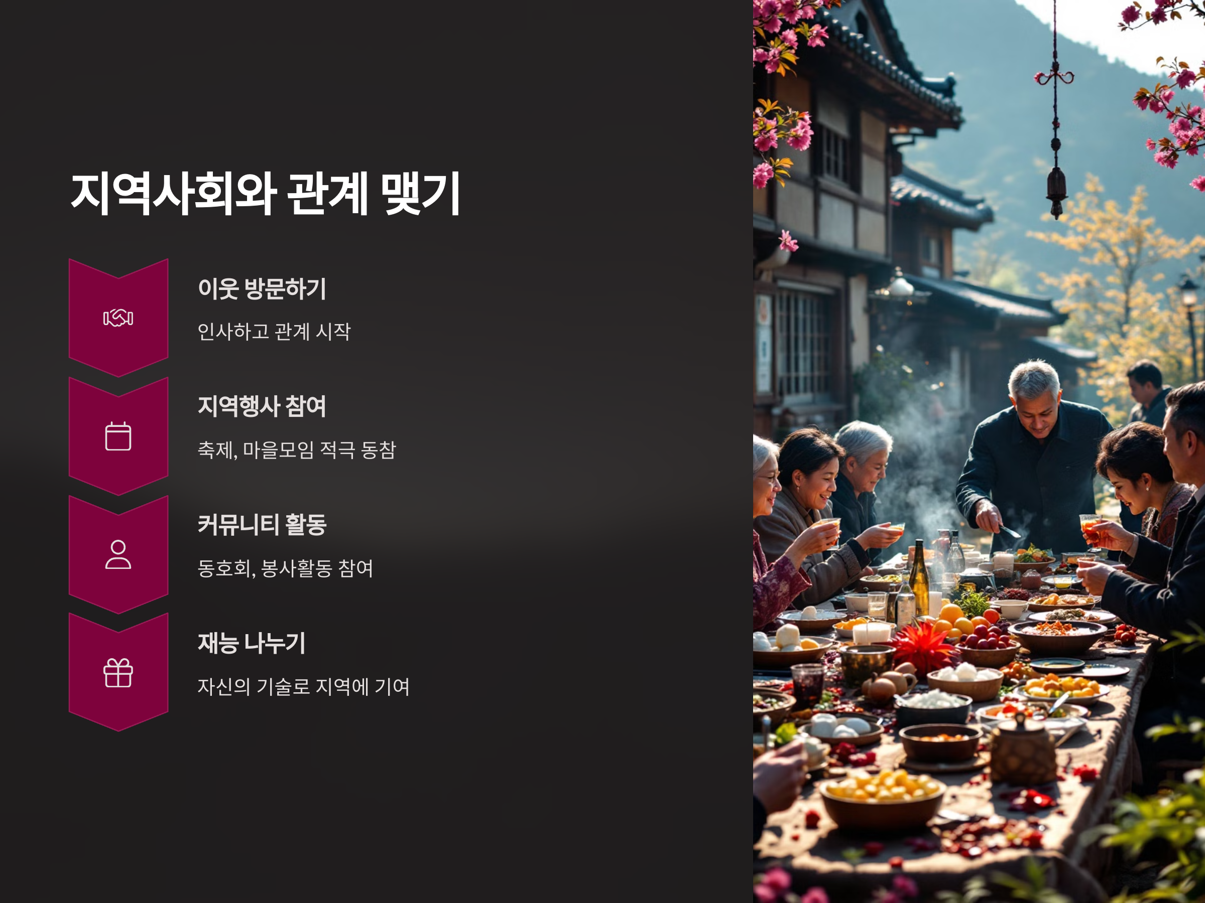 귀촌 후, 외로움을 극복하려면 지역 주민들과의 관계가 매우 중요합니다. 적극적으로 지역 커뮤니티 활동에 참여하고, 이웃들과 친분을 쌓는 것이 좋습니다. 또한, 지역 행사나 축제에 참여하는 것도 좋은 방법입니다. 이를 통해 자연스럽게 사람들과 소통할 수 있습니다.