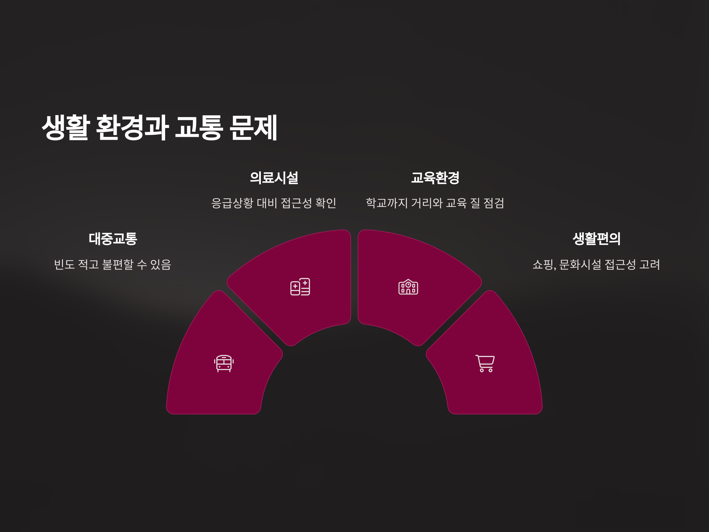 도시에서 벗어나 시골로 가는 것은 평화롭고 여유로운 생활을 의미하기도 하지만, 교통 편의성에 대한 문제가 생길 수 있습니다. 특히, 대중교통의 빈도가 적거나 도로가 불편한 지역에서는 일상적인 이동에 어려움을 겪을 수 있습니다. 귀촌을 고려하고 있다면, 주거지와 주요 교통편, 병원이나 학교 등의 인프라가 어떻게 되어 있는지를 충분히 조사하는 것이 중요합니다.