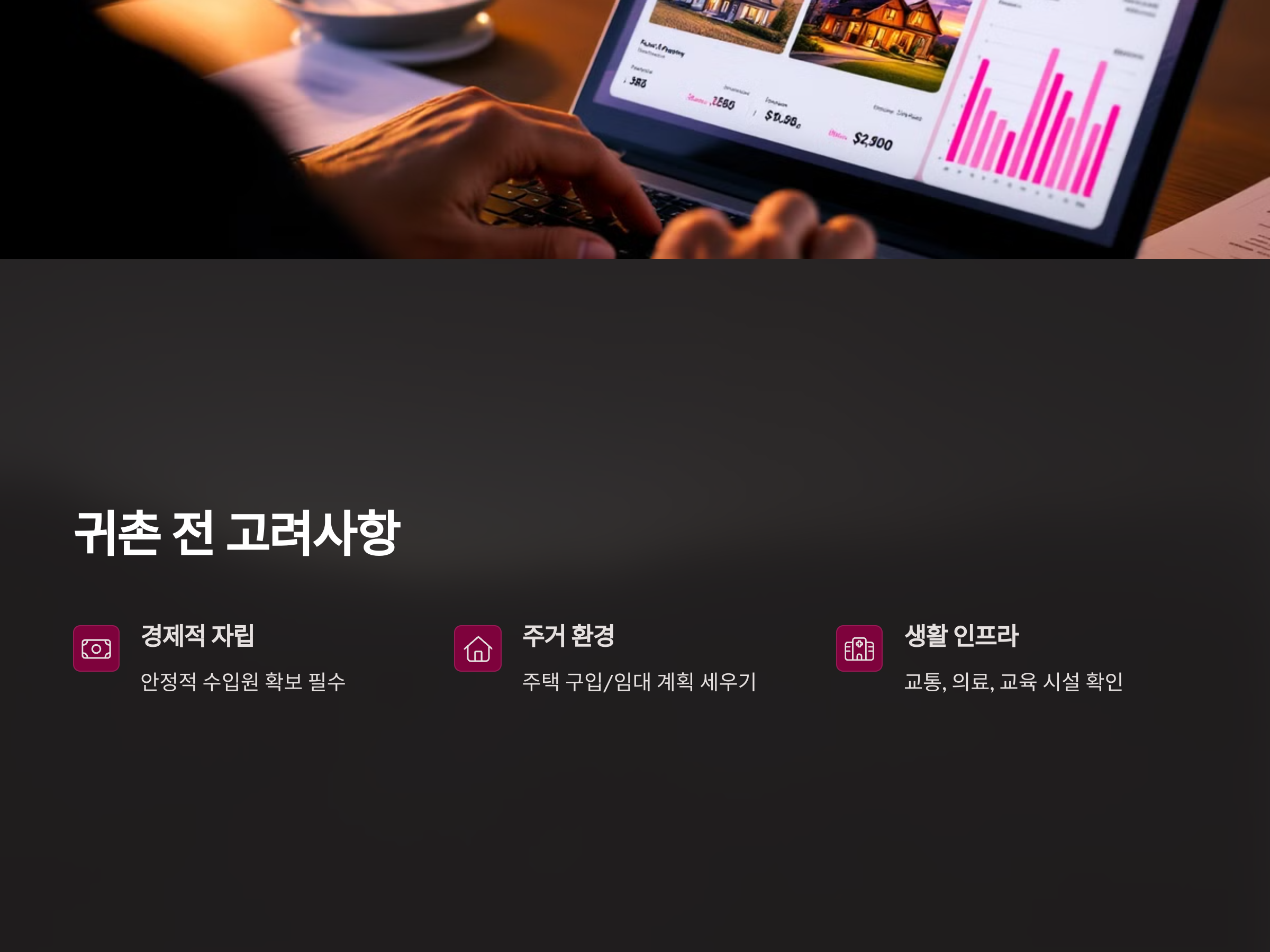 A1: 경제적 자립과 생활 편의성입니다. 귀촌 후 안정적인 소득을 유지할 수 있을지, 교통과 의료 인프라 등이 잘 갖춰져 있는지를 꼭 확인해야 합니다.