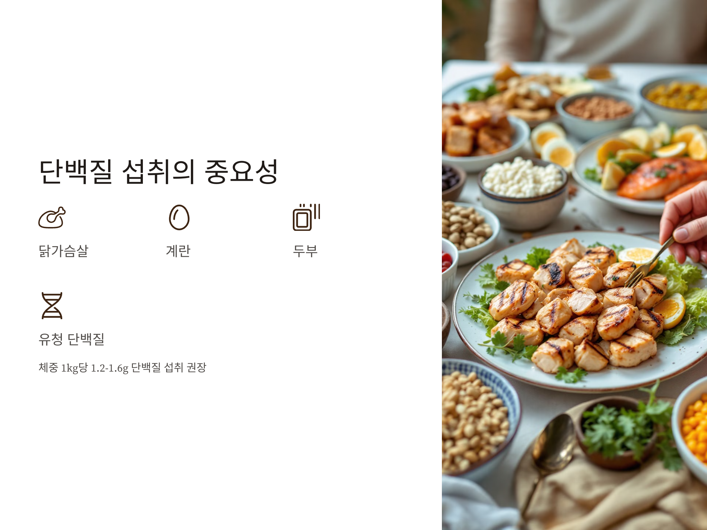 단백질 섭취는 식사를 통해 충분히 할 수 있지만, 바쁜 일정을 고려해 보충제를 활용하는 것도 좋은 방법입니다. 닭가슴살, 계란, 두부, 콩, 그리고 유청 단백질(Whey Protein) 등을 통해 꾸준히 단백질을 섭취하면 근육량을 유지하는 데 도움이 됩니다.