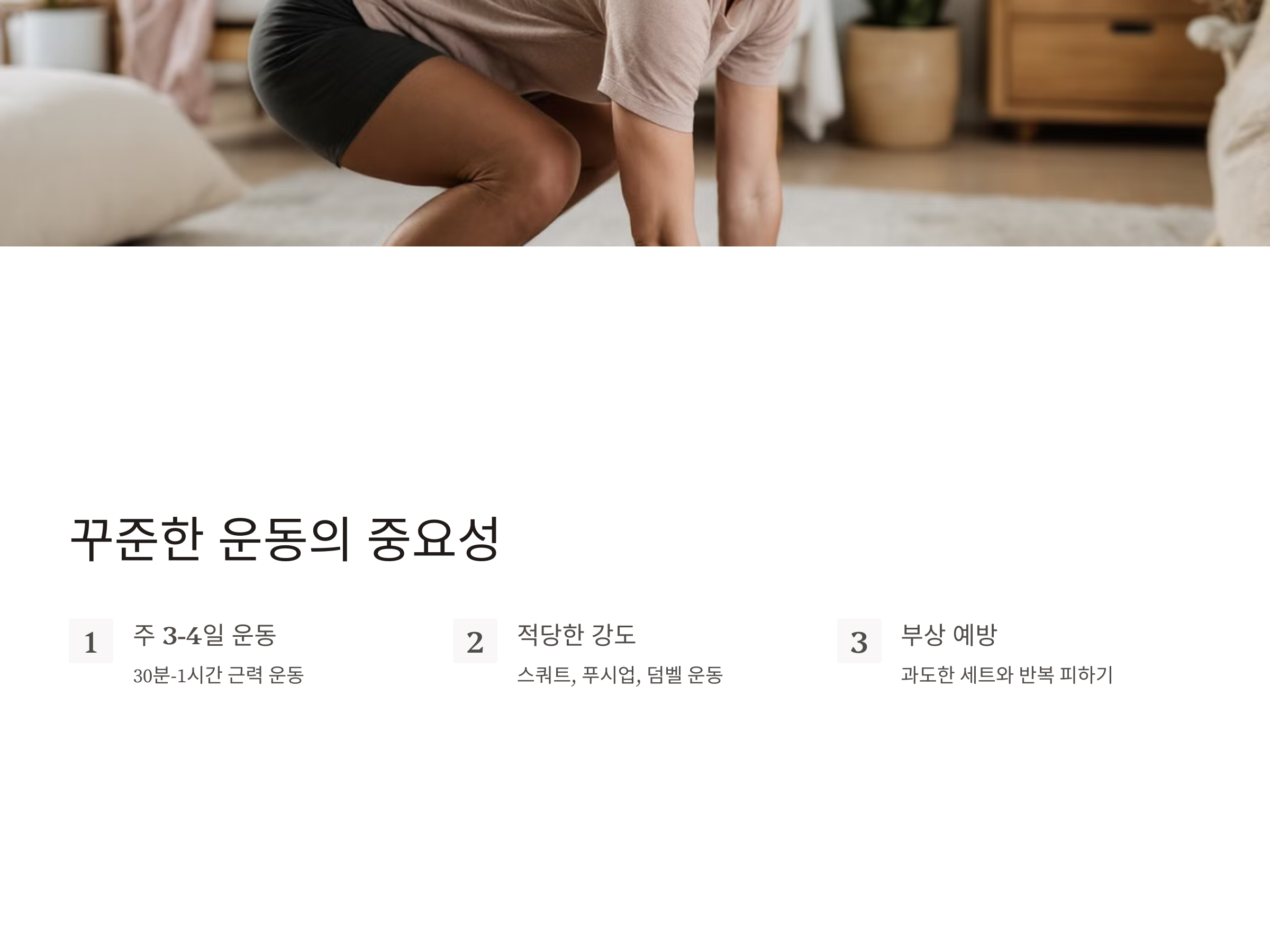 기본적으로 스쿼트, 푸시업, 덤벨 운동 등 자극을 주는 운동들을 주 3회 정도 반복하는 것만으로도 충분히 근육을 유지할 수 있습니다. 이때 너무 많은 세트와 반복을 할 필요는 없고, 적당한 강도로 운동을 해야 부상을 예방하고 효과를 극대화할 수 있습니다.