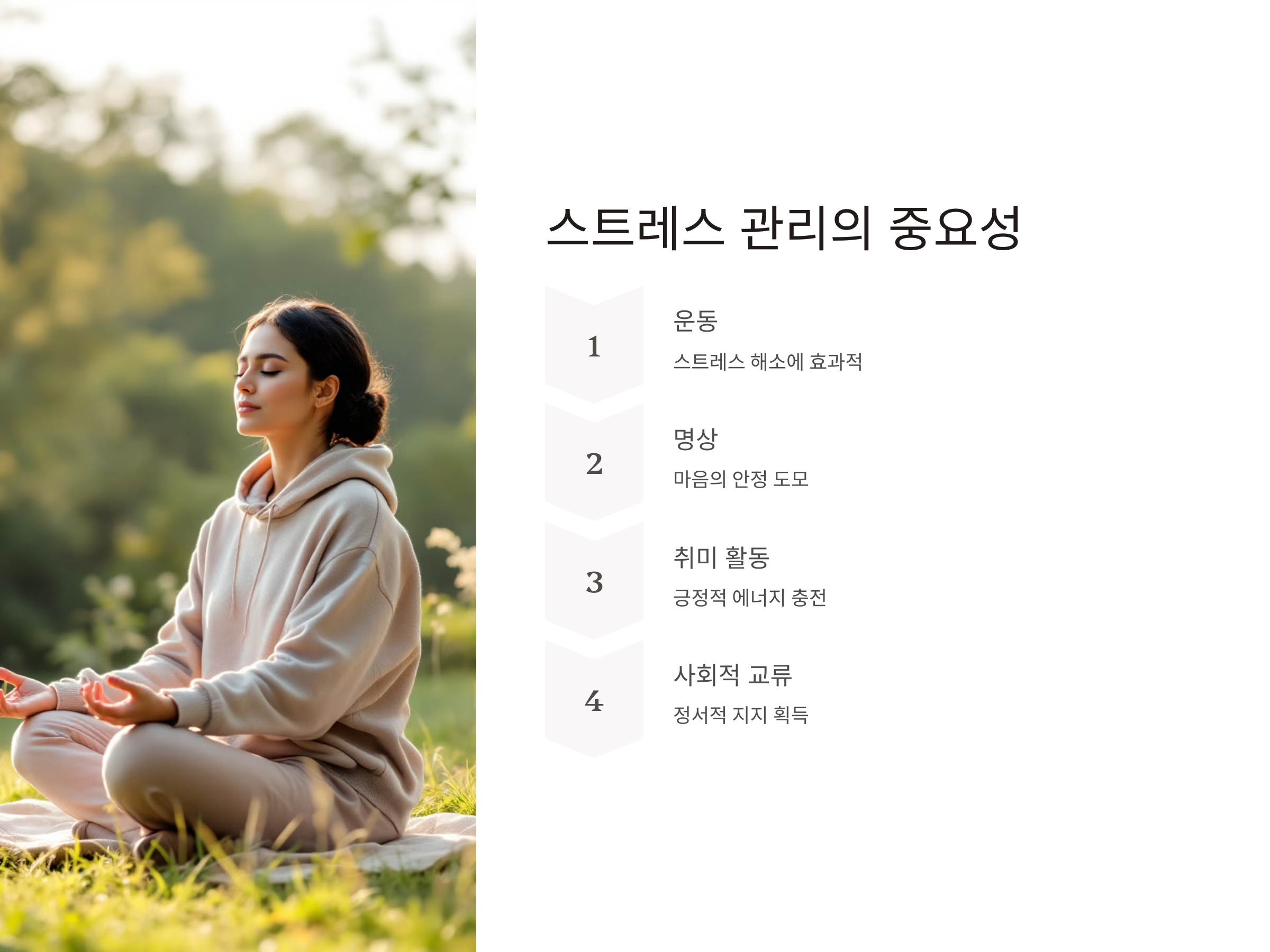 스트레스를 관리하는 방법은 다양합니다. 운동, 명상, 취미 활동, 친구나 가족과의 시간 등을 통해 스트레스를 풀어주는 것이 좋습니다. 또한, 규칙적인 운동을 통해 스트레스를 자연스럽게 줄이는 것도 근육량을 유지하는 데 도움이 됩니다.