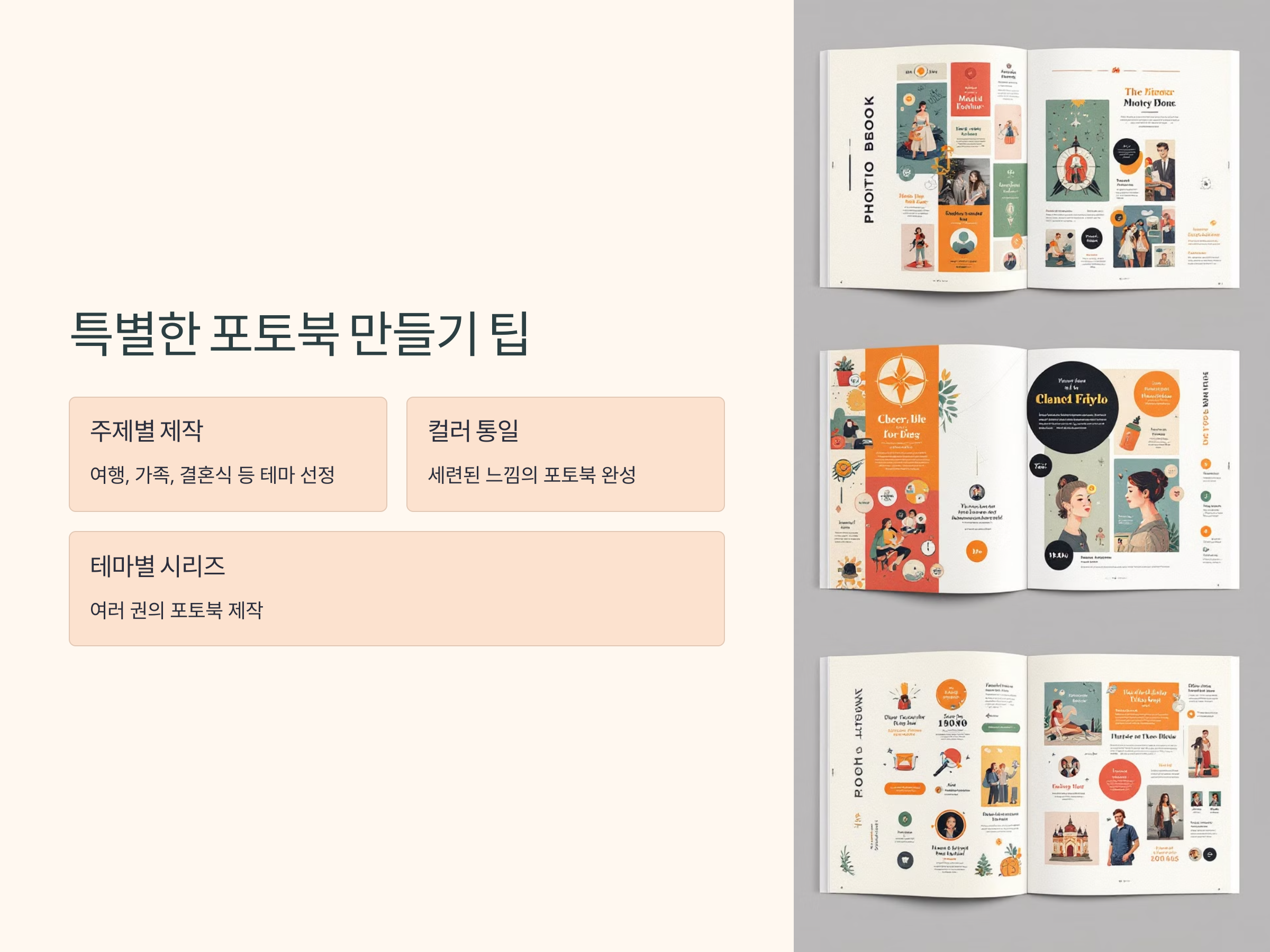 포토북을 더 특별하게 만드는 팁은 다양합니다. 예를 들어, 주제별로 포토북을 만들거나, 사진의 컬러를 통일하여 세련된 느낌을 줄 수도 있습니다. 또, 포토북을 테마별로 나누어 제작해 여러 권의 책을 만들 수도 있습니다.