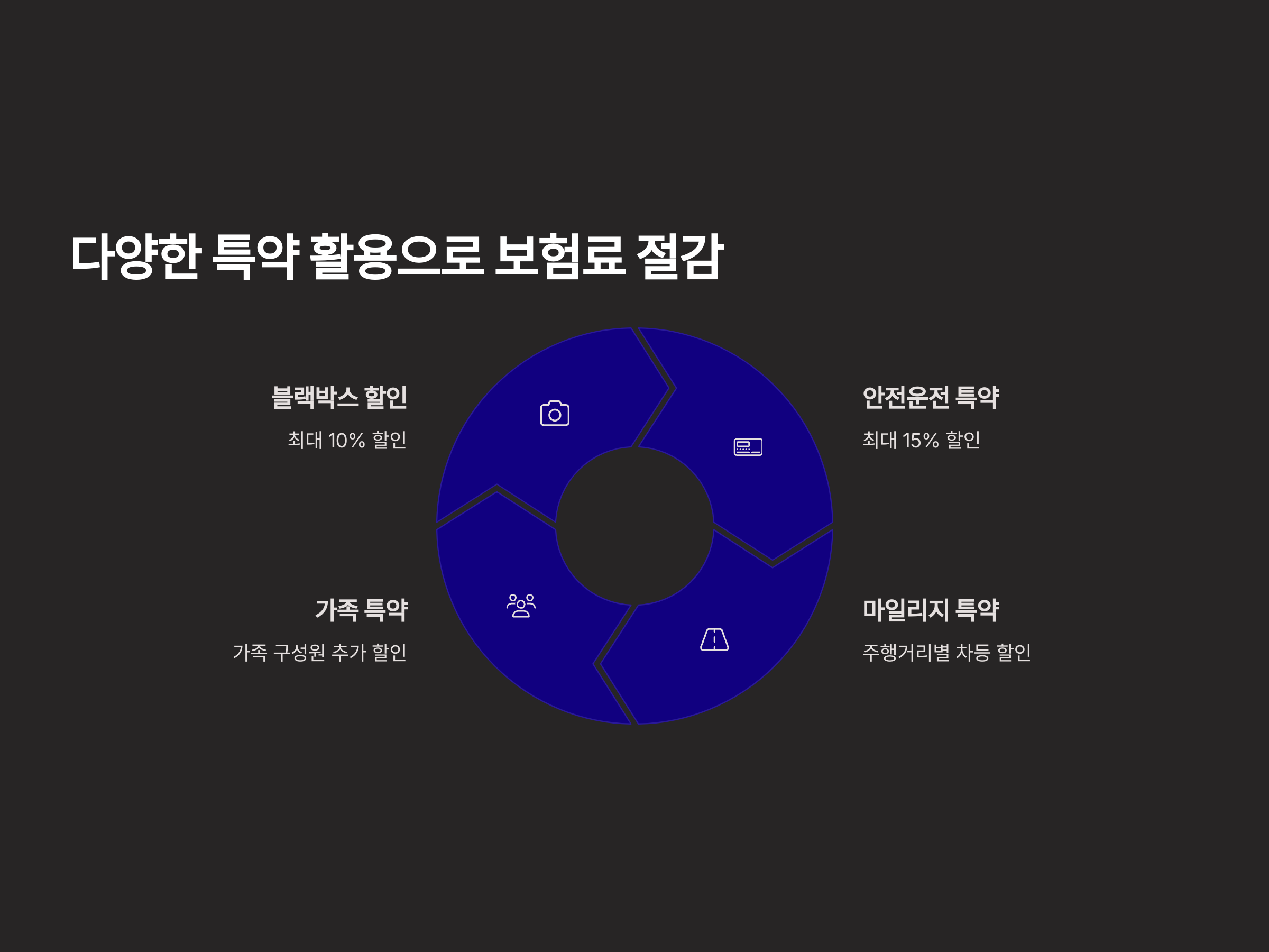 보험사들은 다양한 특약을 통해 운전자들에게 맞춤형 할인 혜택을 제공합니다. 예를 들어, '블랙박스 할인 특약'은 차량에 블랙박스를 장착한 경우 최대 10%의 보험료 할인을 제공합니다. 또한, '안전운전 특약'은 운전 습관을 분석하여 안전 운전을 하는 경우 최대 15%의 할인을 제공합니다. 이러한 특약을 적극 활용하면 보험료를 크게 절감할 수 있습니다. 그러나 각 특약의 적용 조건과 할인율은 보험사마다 다르므로, 가입 전에 반드시 확인해야 합니다.