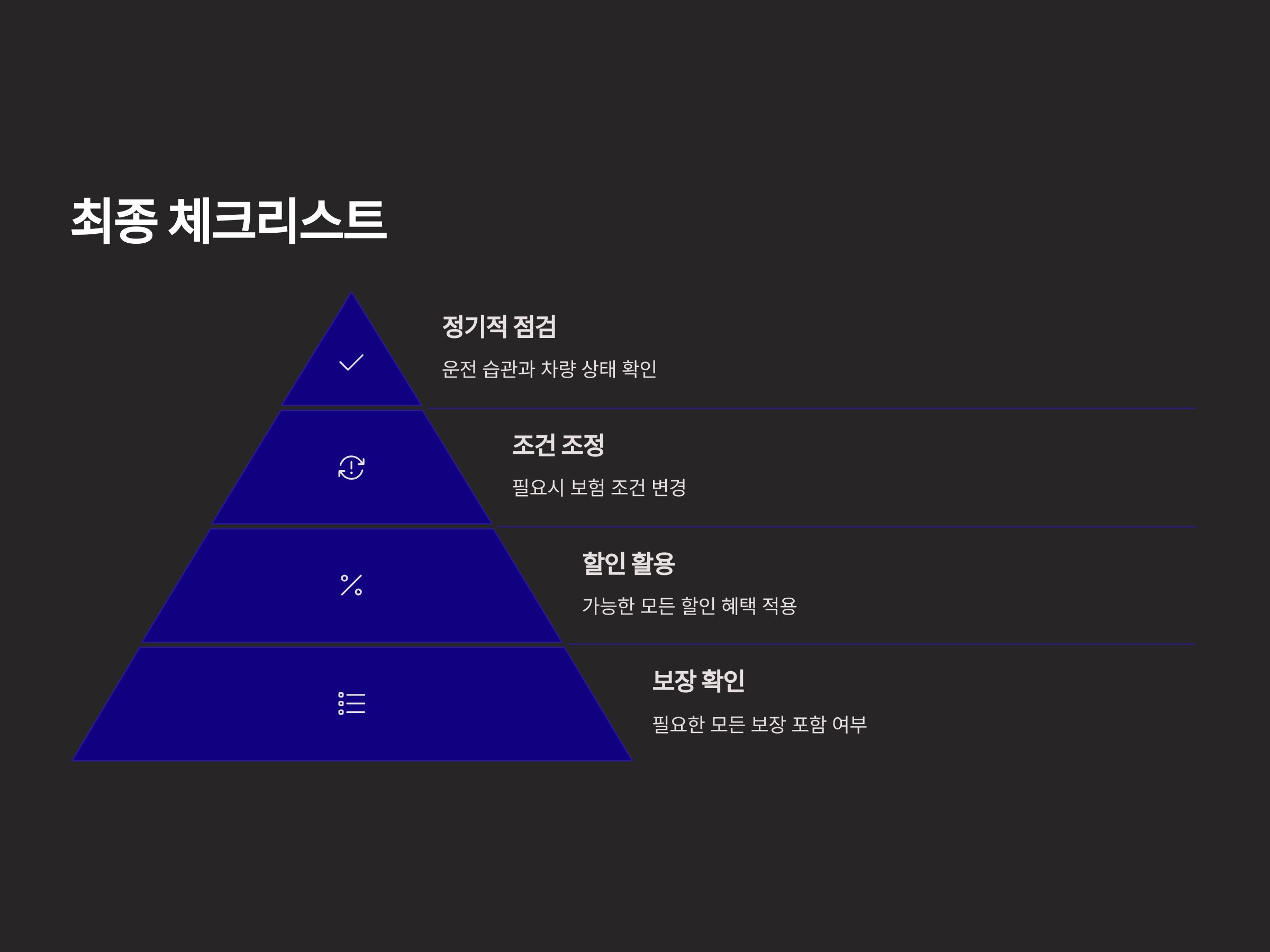 보험 가입 시에는 보장 범위, 면책금, 특약 조건 등을 꼼꼼히 확인해야 합니다. 특히, 보험료가 저렴하다는 이유만으로 선택하기보다는 보장 내용과 자신의 운전 습관을 고려하여 종합적인 판단을 해야 합니다. 또한, 보험사별로 제공하는 할인 혜택과 특약을 최대한 활용하여 보험료를 절감하는 것이 중요합니다. 마지막으로, 보험 가입 후에도 정기적으로 자신의 운전 습관과 차량 상태를 점검하고, 필요에 따라 보험 조건을 조정하는 것이 바람직합니다.