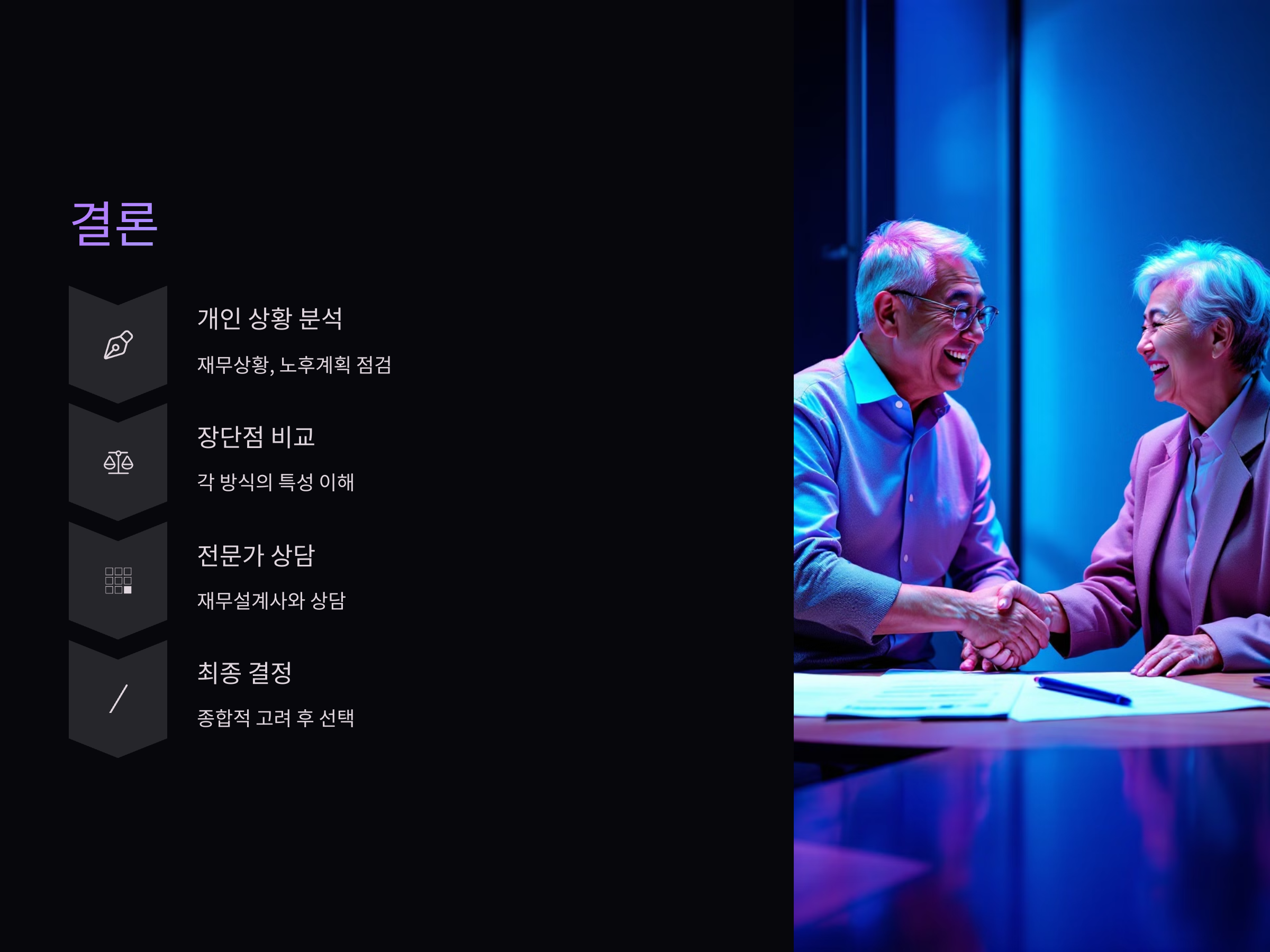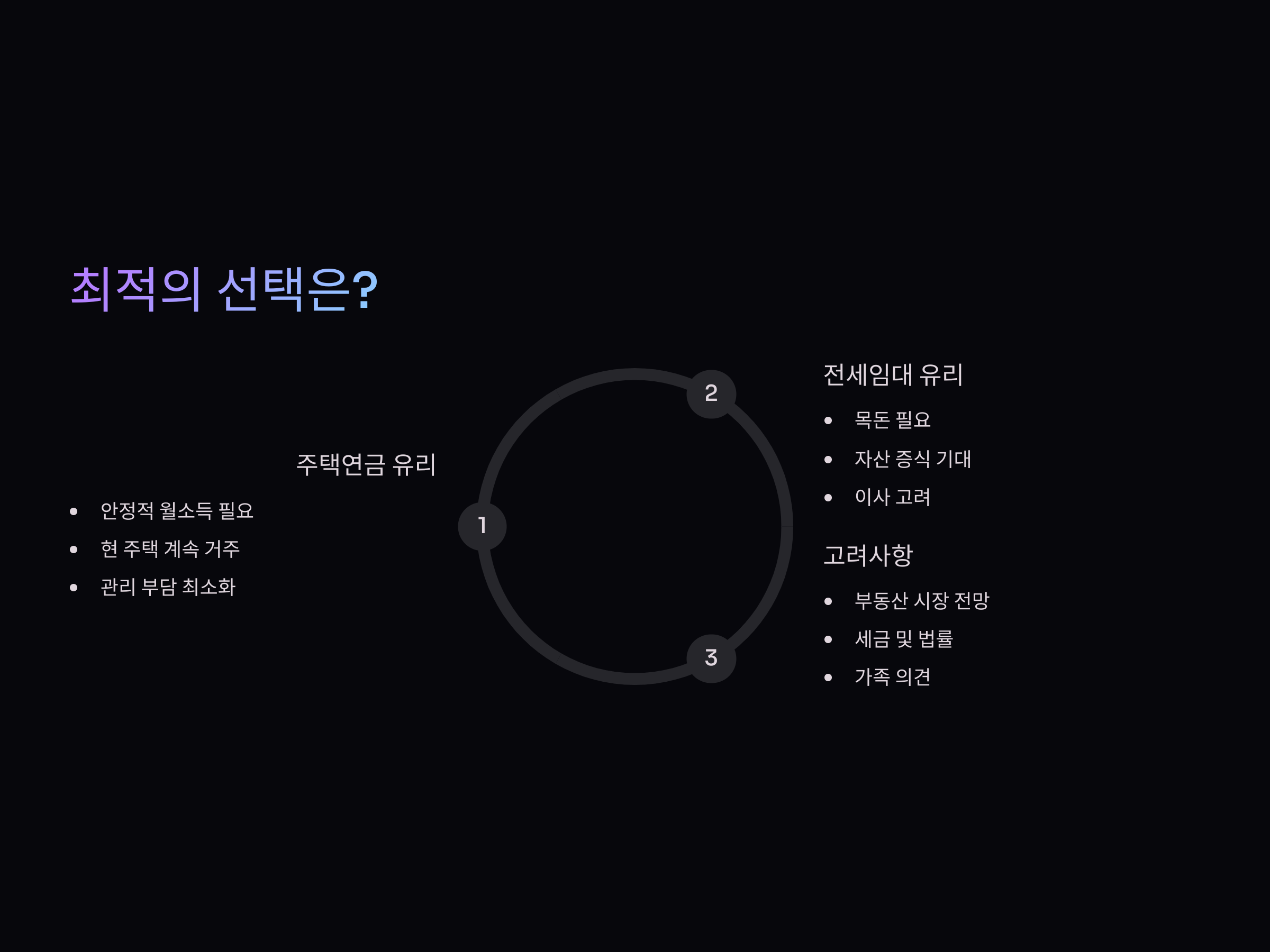 개인의 재무 상황, 노후 계획, 부동산 시장 전망 등에 따라 최적의 선택은 달라집니다.