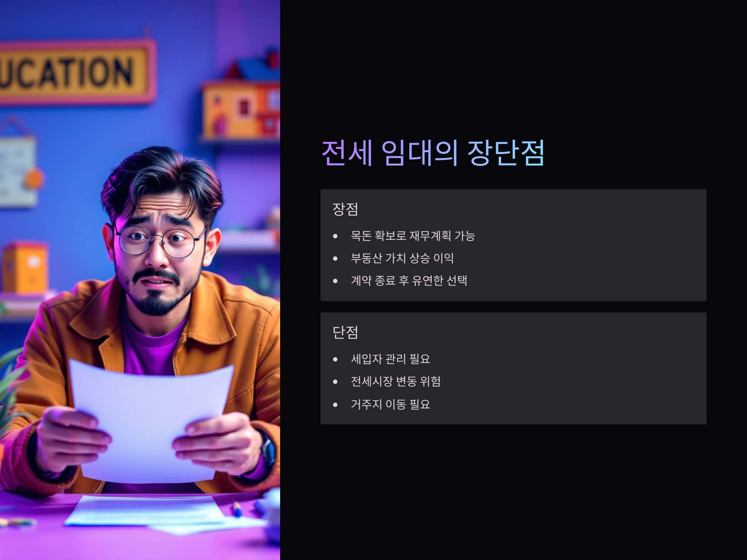 - 수익 변동성: 전세 시장의 변동에 따라 보증금 회수나 재투자에 어려움이 있을 수 있습니다.
