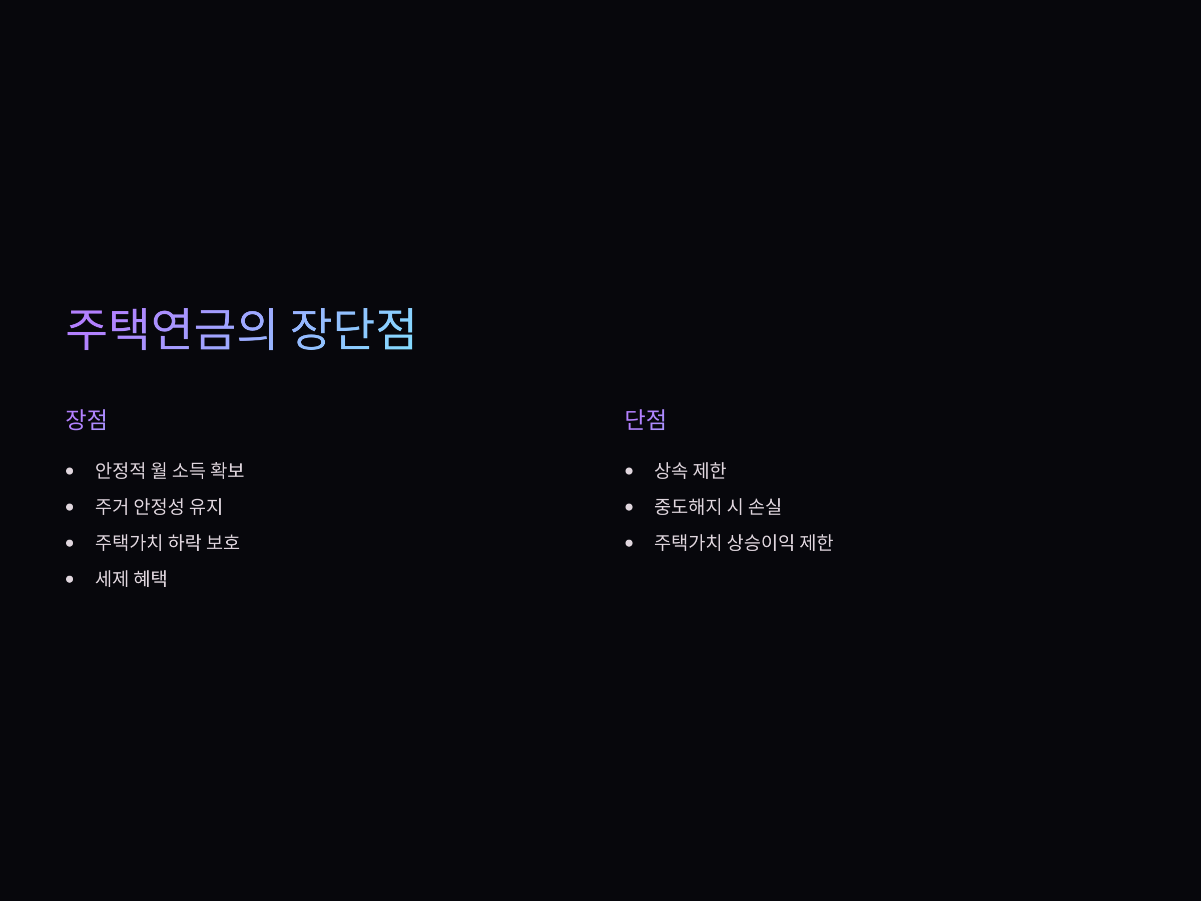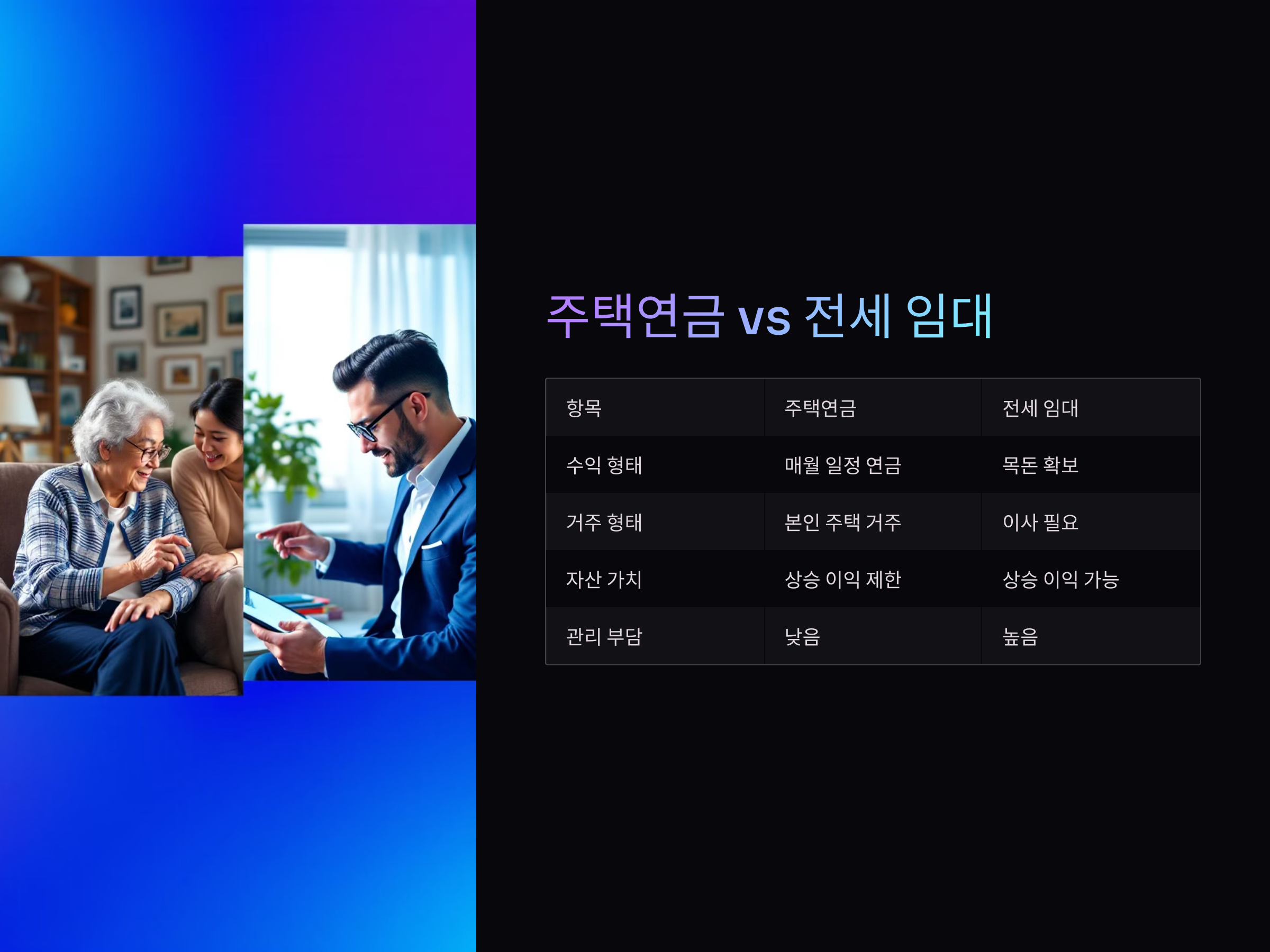 | 수익 형태 | 매월 일정 금액의 연금 수령 | 전세 보증금을 통한 목돈 확보 |